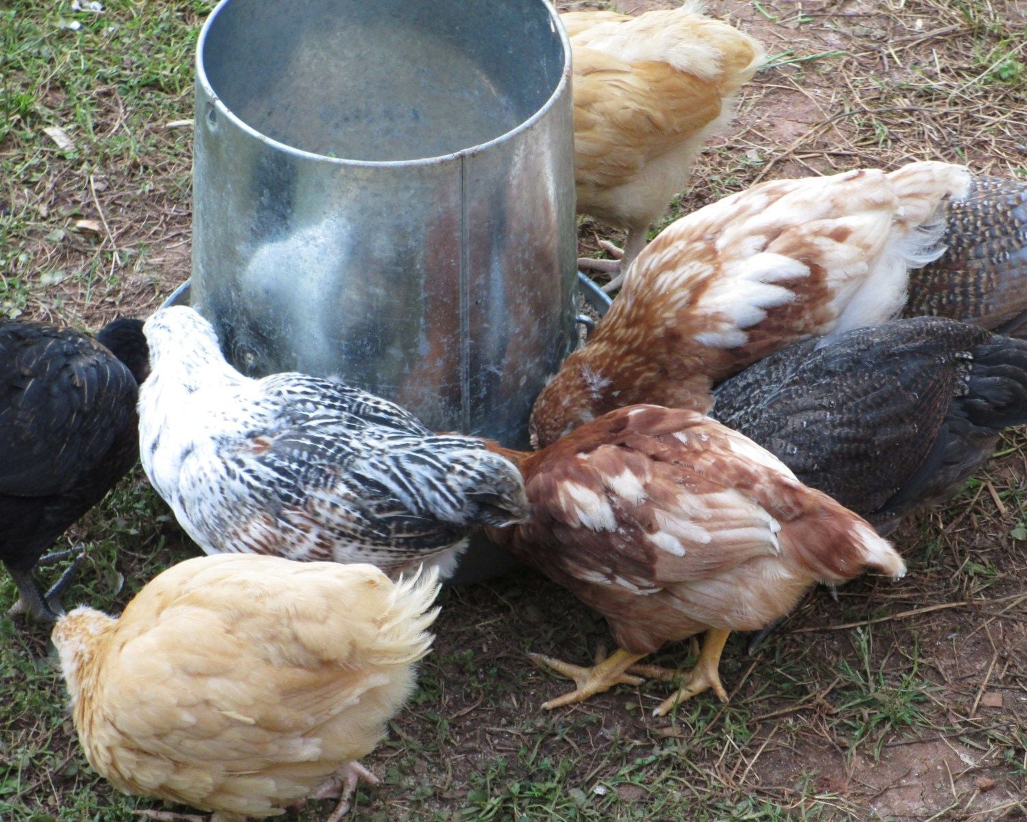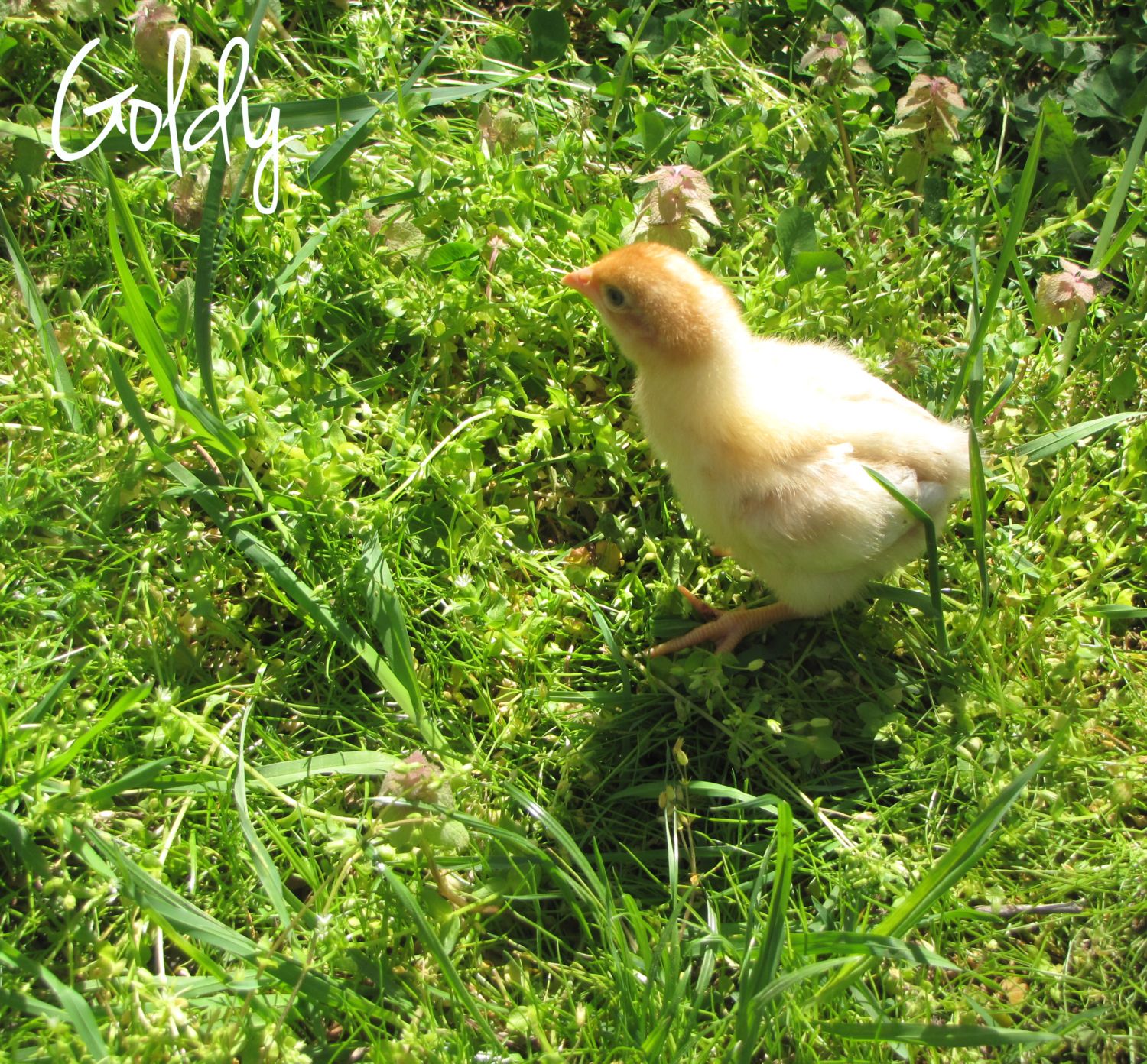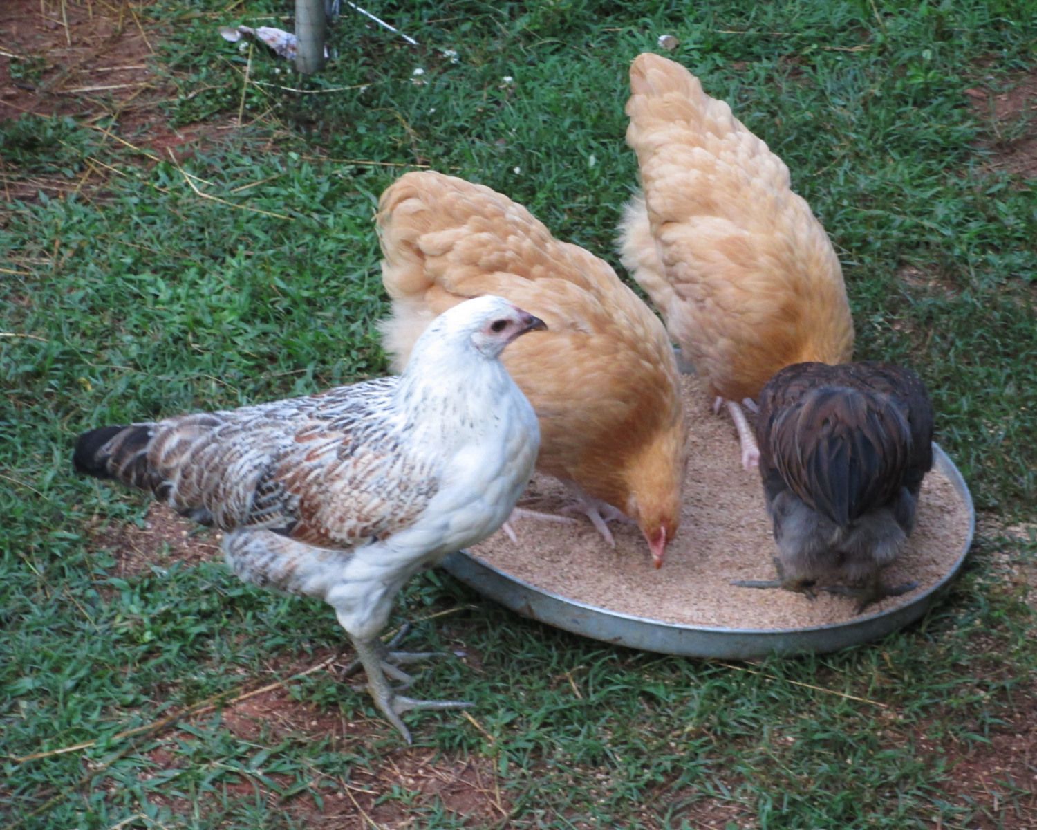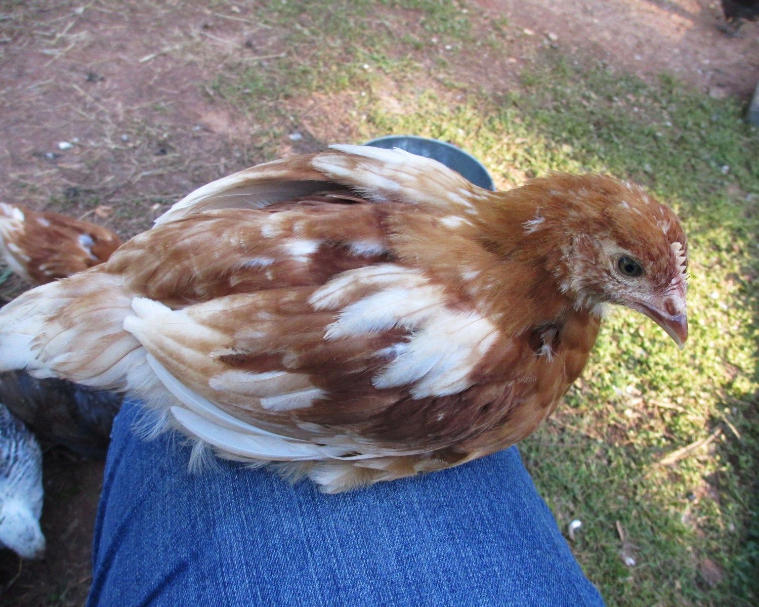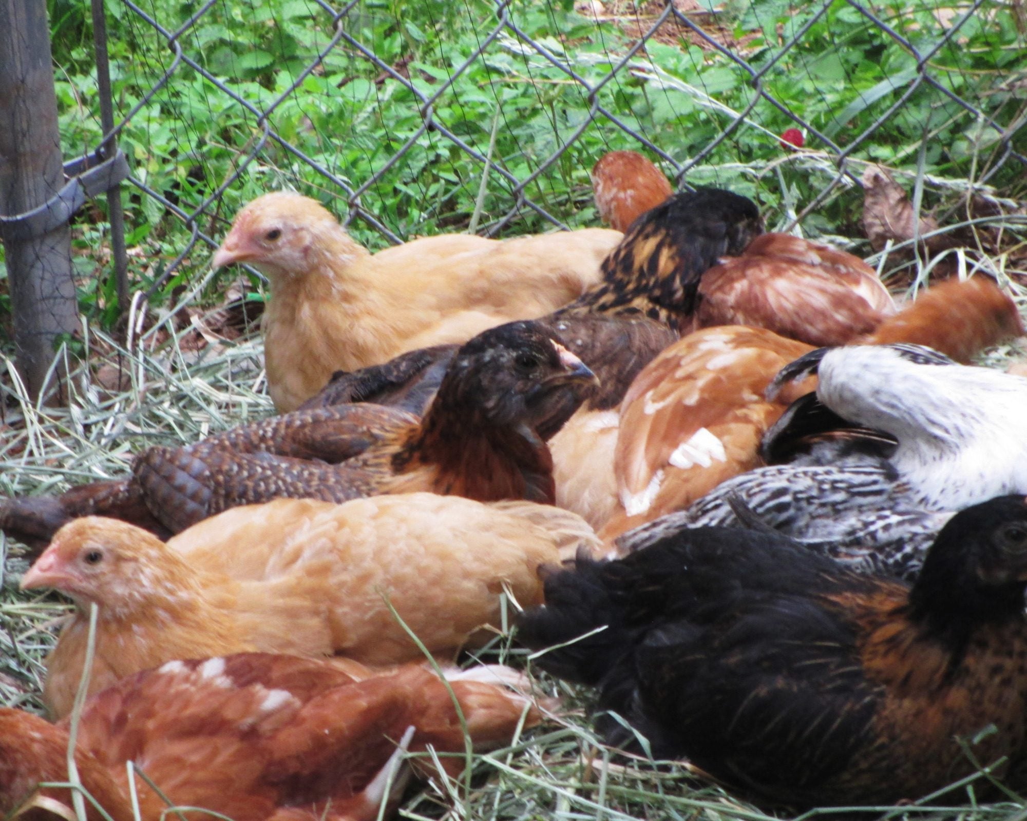 We have a total of eight Golden Comets, four Buff Orpingtons, four Araucana/Americaunas, a White Leghorn, a Black Sex-Link and a Golden-Laced Wyandotte. The ladies are six-weeks old today (May 16, 2013) and are outside in their coop enjoying the warm weather. They've even graduated to full sized waterers and feeders.