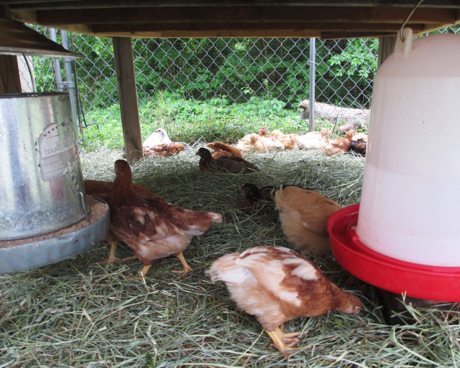 We got the big girl feeder and waterer hung under the coop and added a log playground for the ladies. In an effort to keep the mud at bay with all the rain we've had, we also added a nice thick layer of hay after reading a composting article in the Learning Center.