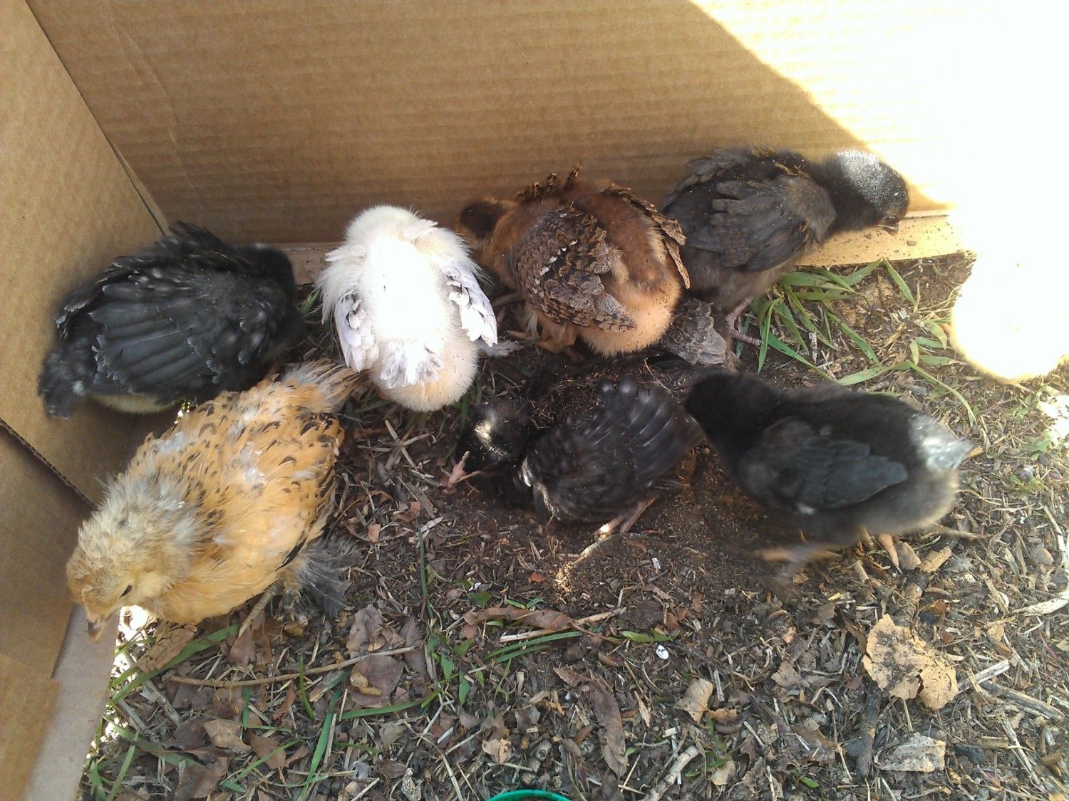 Outdoor adventure! Most of my chicks are right about 2 weeks old, minus one or two that look to be a little older. Yesterday we had great weather, and I decided it was time to let everybody out for a rumble in the dirt and grass. I made myself an open-top-and-bottom box, and found a nice place in the yard to place it. I then transported the entire flock up and let them into the box. Their first impression of the outdoors was that it was very very bright (they live in a basement under the red heat lamp at the moment). They also noticed that there were a ton of other birds chirping. After about 5-10 minutes, they settled in, and began the pech and scratch routine. I dug a few worms out of the garden and added them to the box, leading to more antics in the form of chase and tug-o-war. A few of the chicks discovered the loose dirt, and after some work scratching and making some dust, they began to take dust baths. One of them was getting so enthusiastic, laying on her side while kicking and closing her eyes, then just laying still in the sun, that I had to poke her to make sure she was not having a seizure. All was well, and it was spasms of pure pleasure. Others joined it, and soon I had a dozen dirty chicks. I took them back inside after about 90 minutes, and everyone immeditely went to sleep. Tired chicks! Here are a couple of pics.