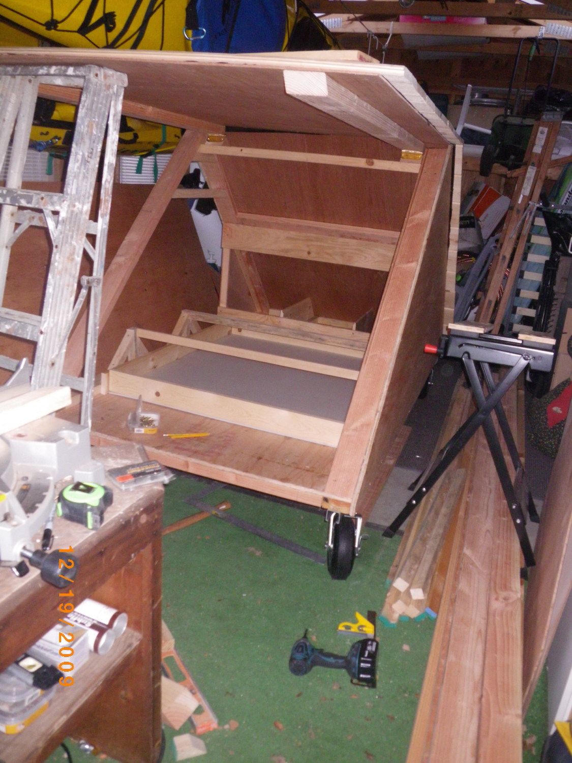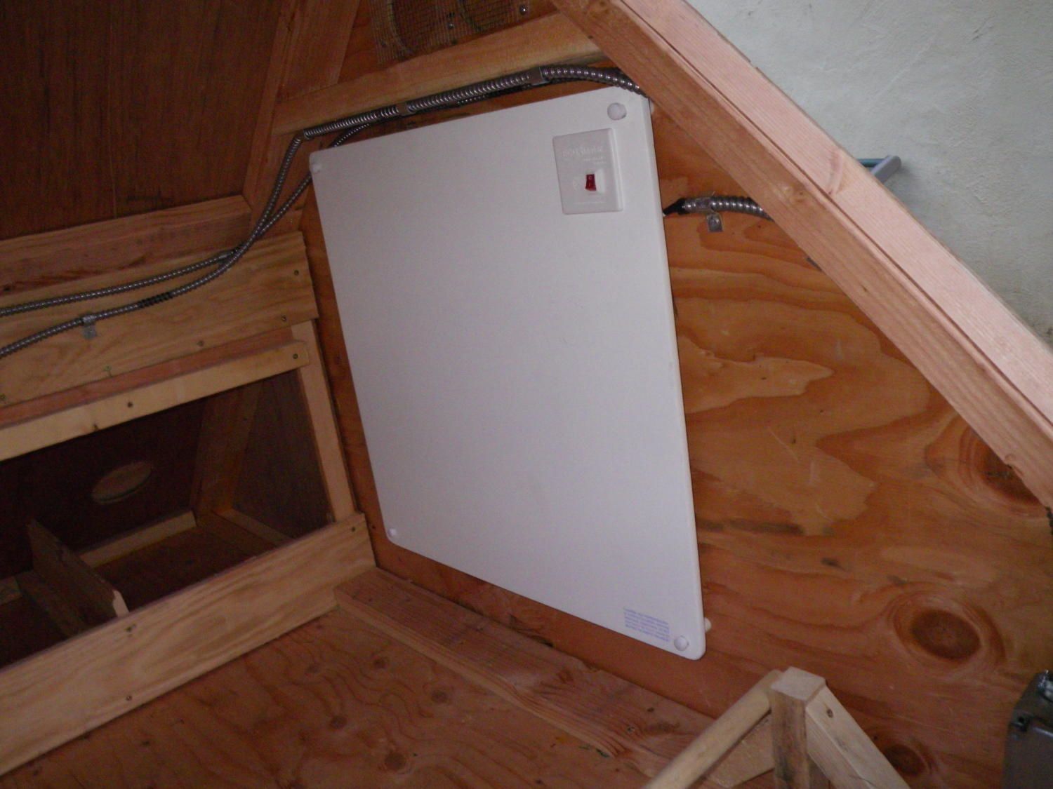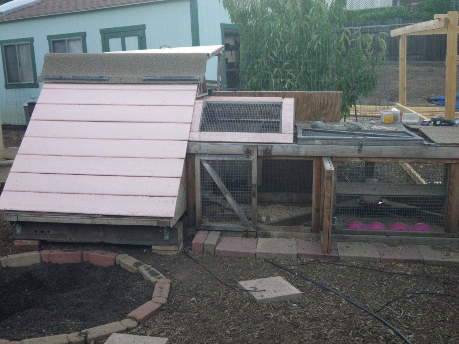 I started off with some plans I downloaded off of the internet but it just wasnt working out. It was an A frame coop with 60 degree angles, but the 60 degrees just seemed ridiculous, too much wasted space at the top, so I decided to go with 45 degrees instead and soon I abandoned the entire plan altogether and just started doing my own thing. I added a section to the run and Im currently adding another section of run which will be a double decker. Now Im thinking about making another actual coop, I REALLY want to get some bantam easter eggers and I dont want to crowd the girls, I have 4 chickens right now with a silkie sitting on three eggs, not sure if a couple of them are going to hatch. The coop has lights and plugs, (everything has to have lights and plugs when you're an electrician), a flat panel heater which I hooked up to a thermostat and a couple of fans on a timer to move the air around when it gets hot. Originally I had wheels on it so I could move it around but it got so heavy I took the wheels off and set it on railroad ties. I put heavy stepping stones around the outside of it to keep critters from digging underneath it. I started to paint it but now Im busy making it bigger. I live in a 100 year old house that needs a ton of work so what do I do? I build the fanciest chicken coop in the neighborhood. Oh well....