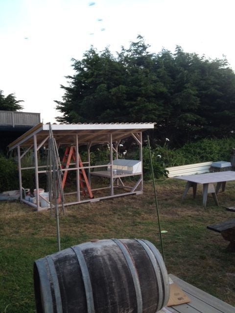 We are in progress for The Sea Shell Coop. It is a coop by the sea with windy, somewhat rainy weather. I originally planned on the coop itself being 4'x4' with 3 nest boxes and a 4'x12' enclosed run. My husband and I traded a truck to our retired carpenter friend for work- trade. So, he is helping us in the construction and with materials.