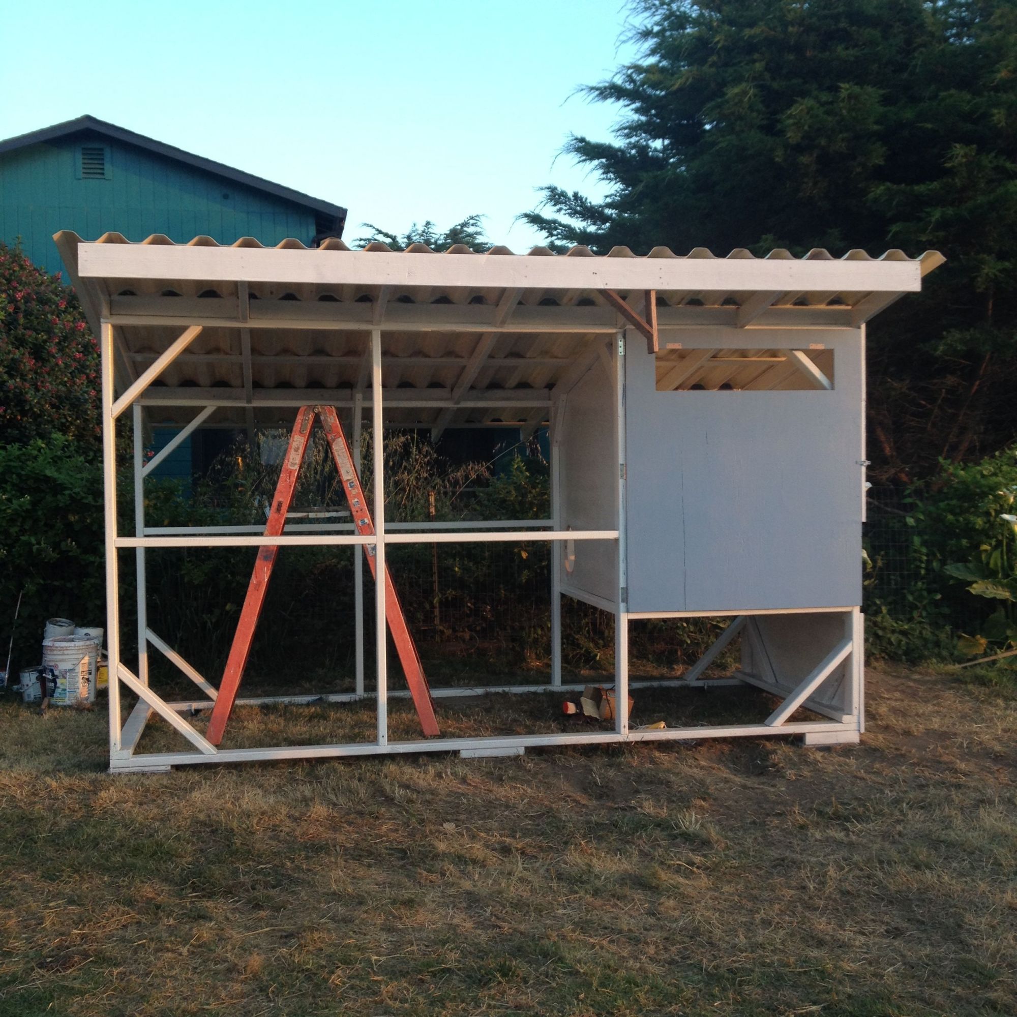 Day 3: Constructing the coop and caulking in foam thingies that came with the (used) corrugated roofing.