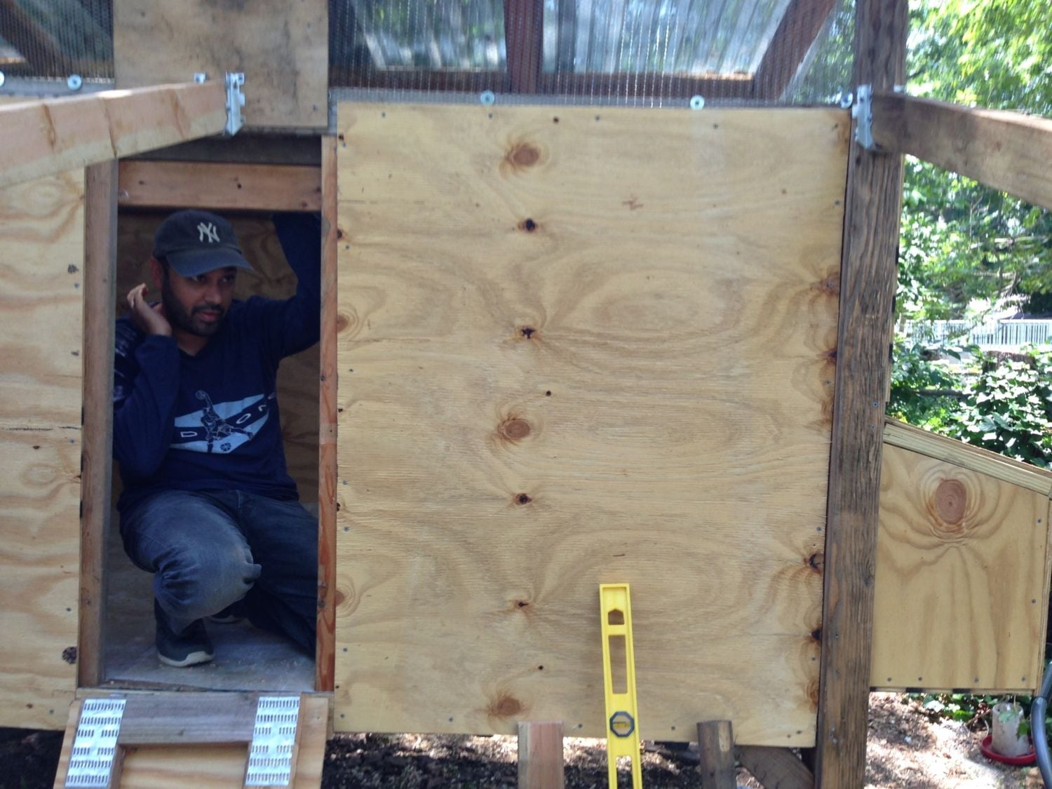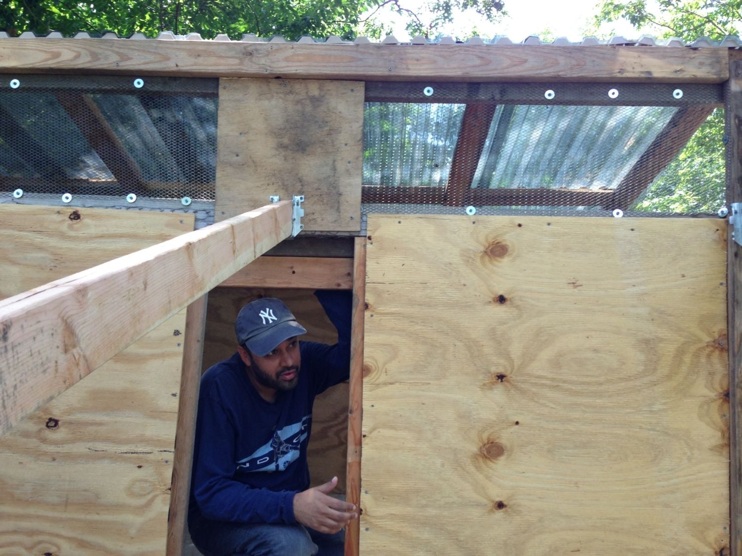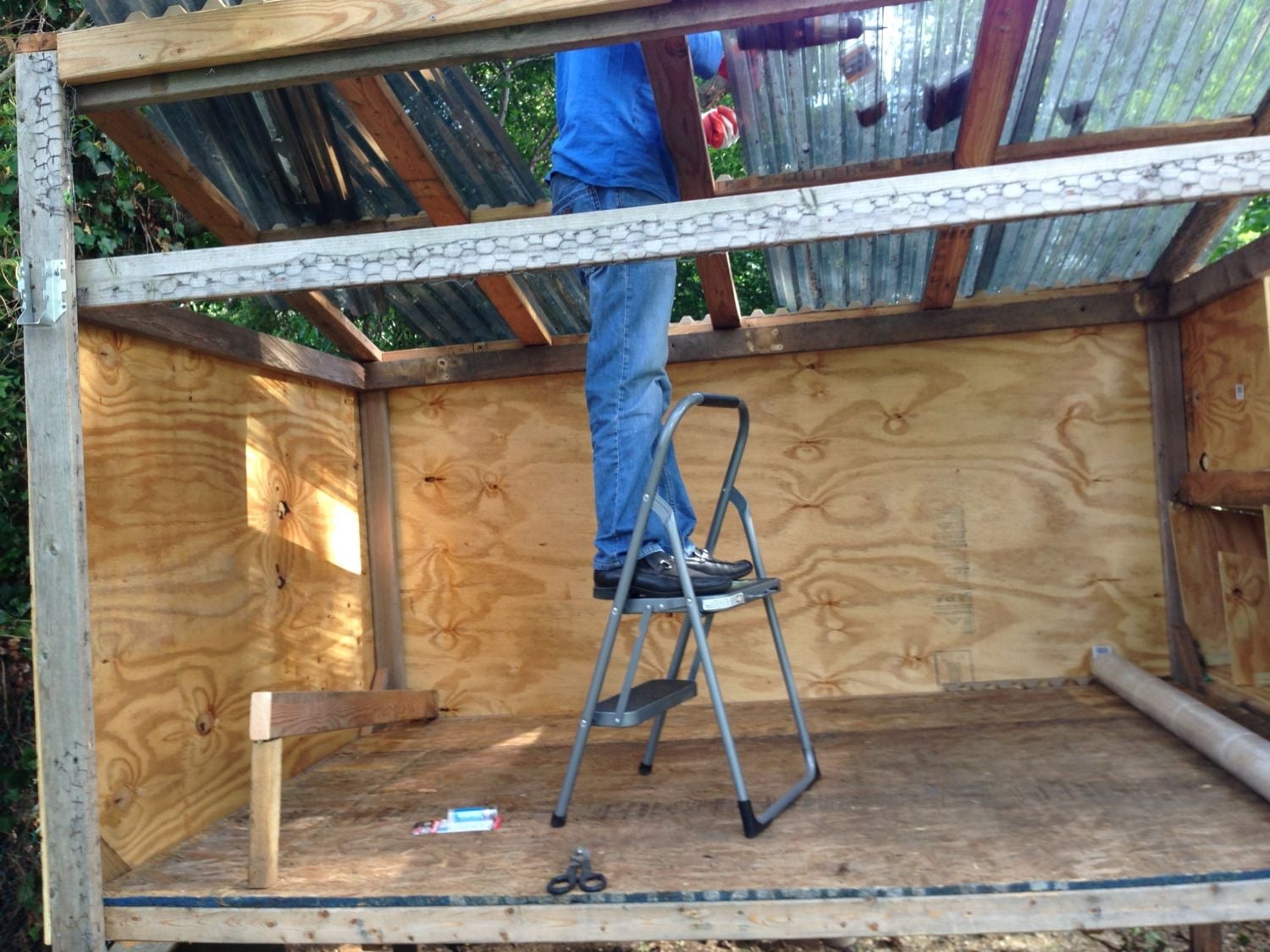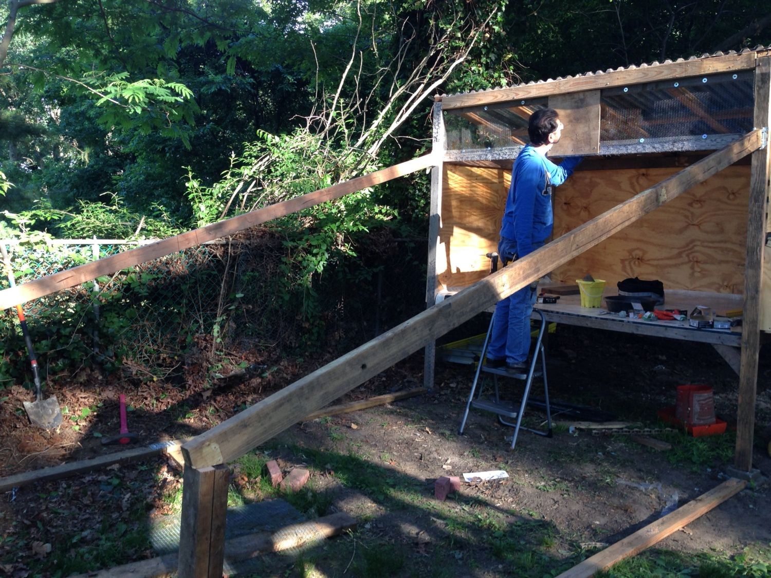 That is my uncle helping me with the roof design. In the back you see that we are using the existing wood from the old coop as we go along.