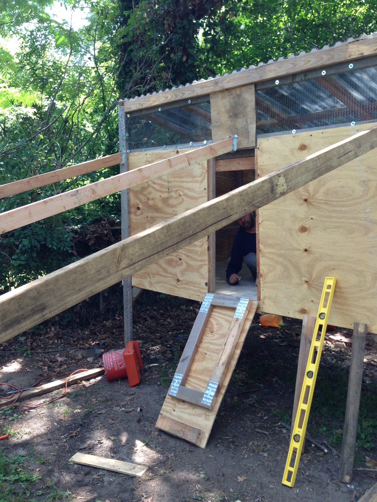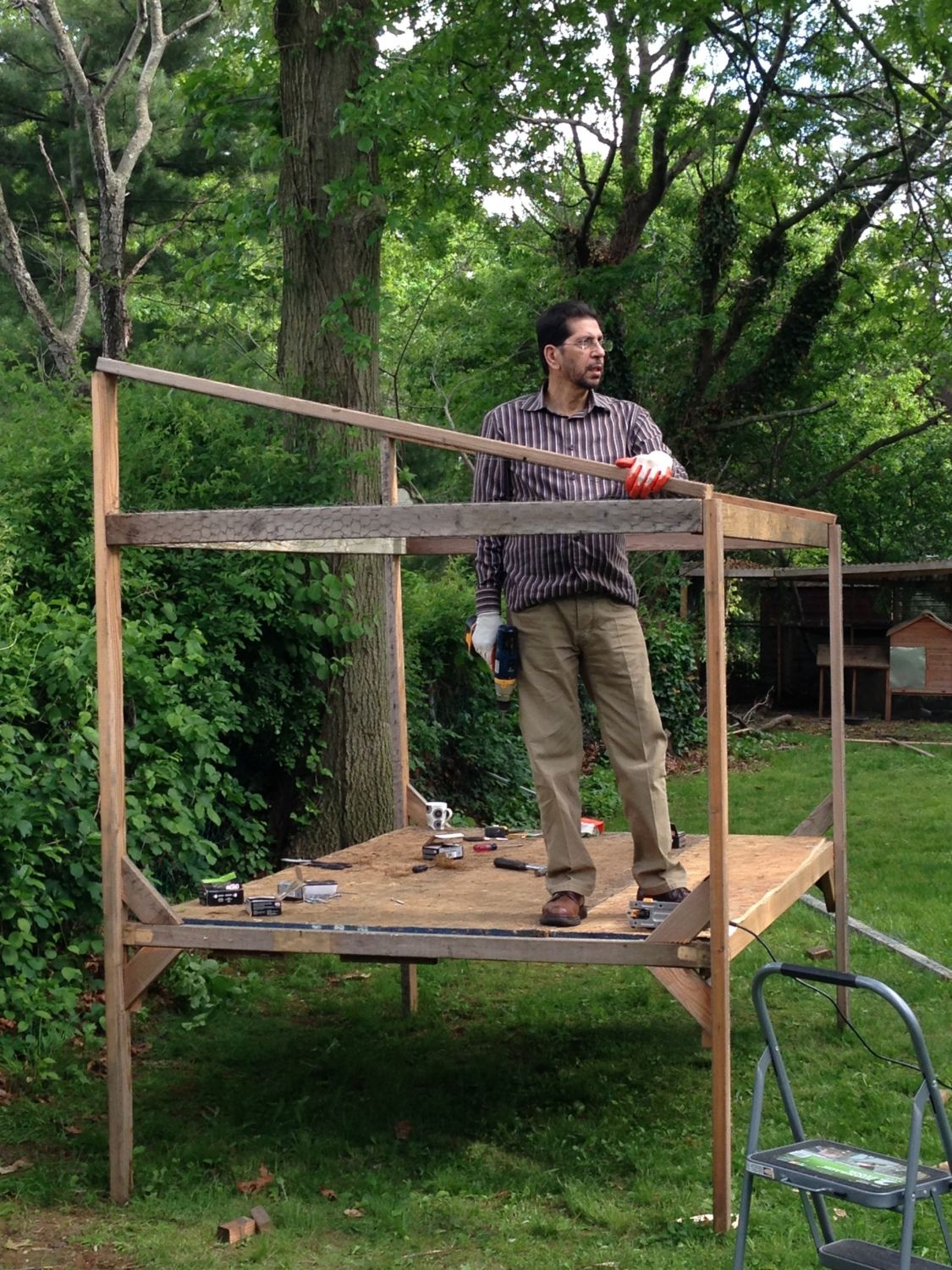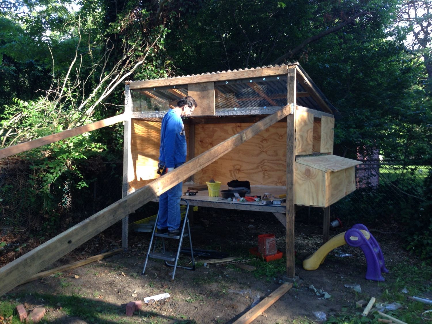 That is my uncle helping me with the roof design. In the back you see that we are using the existing wood from the old coop as we go along.