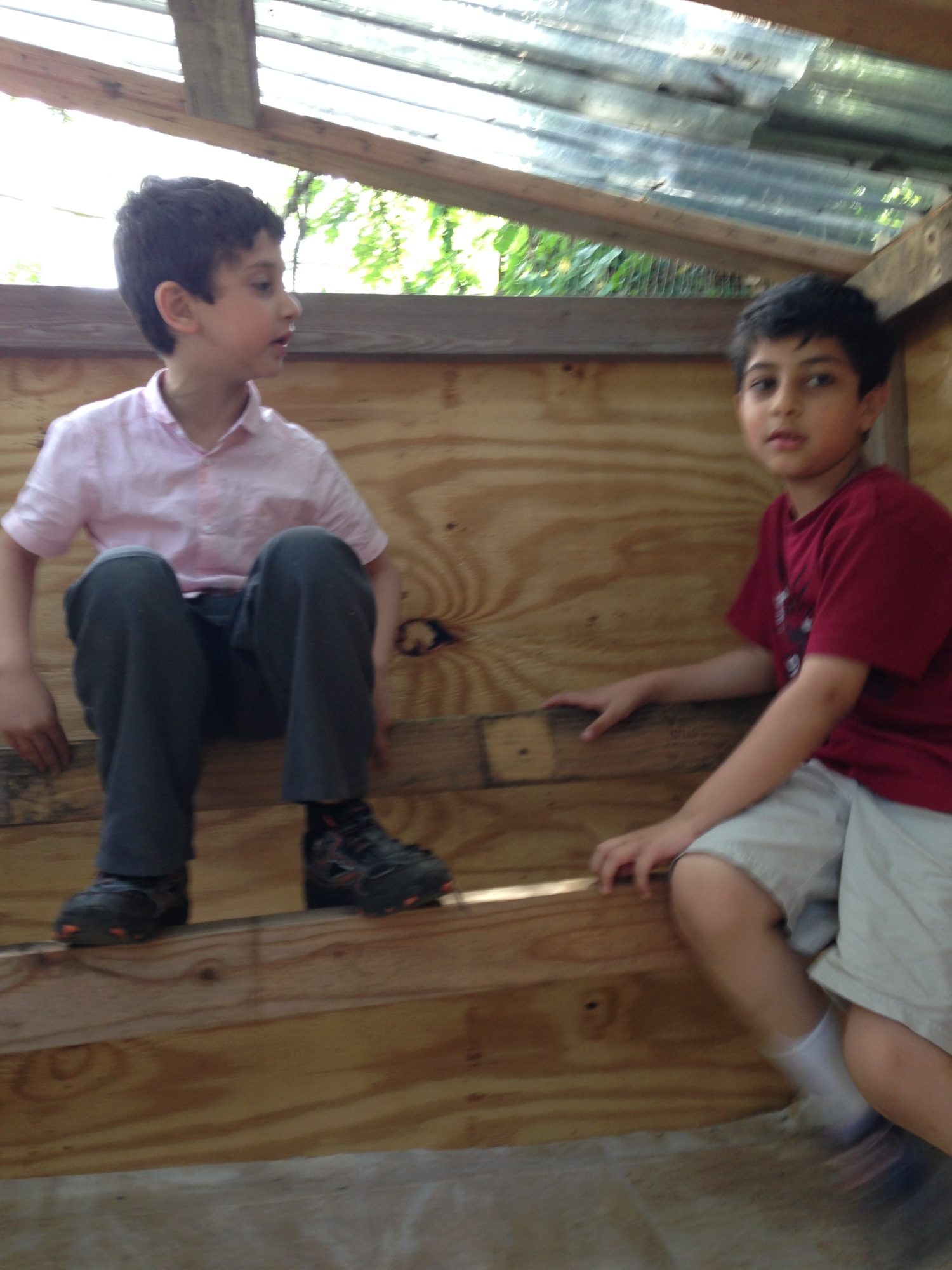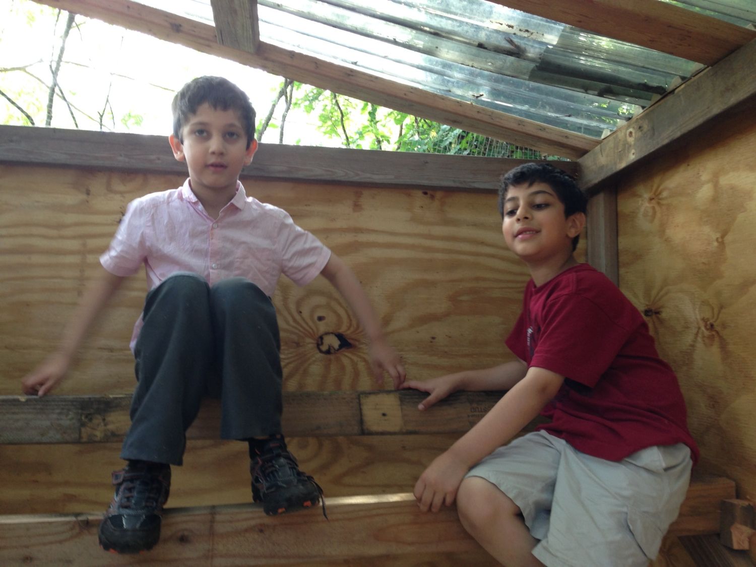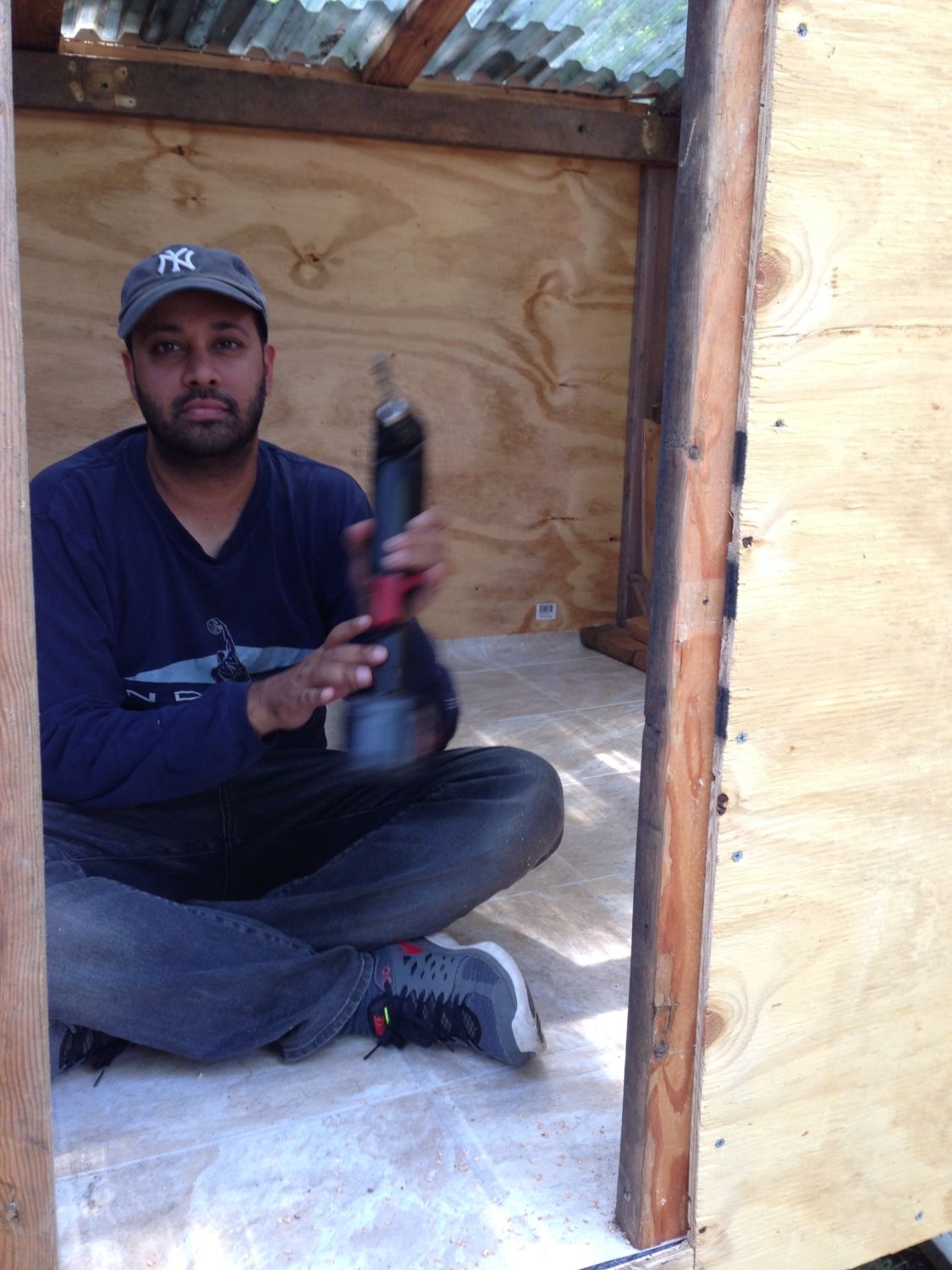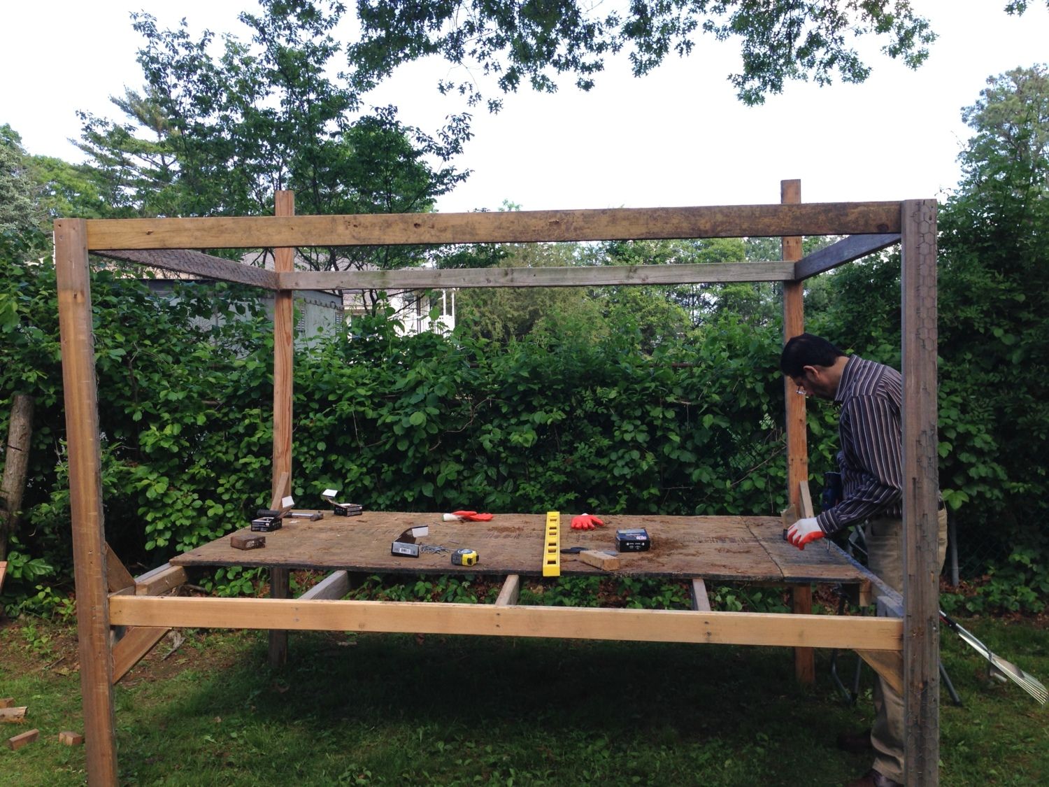 That is my uncle helping me with the roof design. In the back you see that we are using the existing wood from the old coop as we go along.