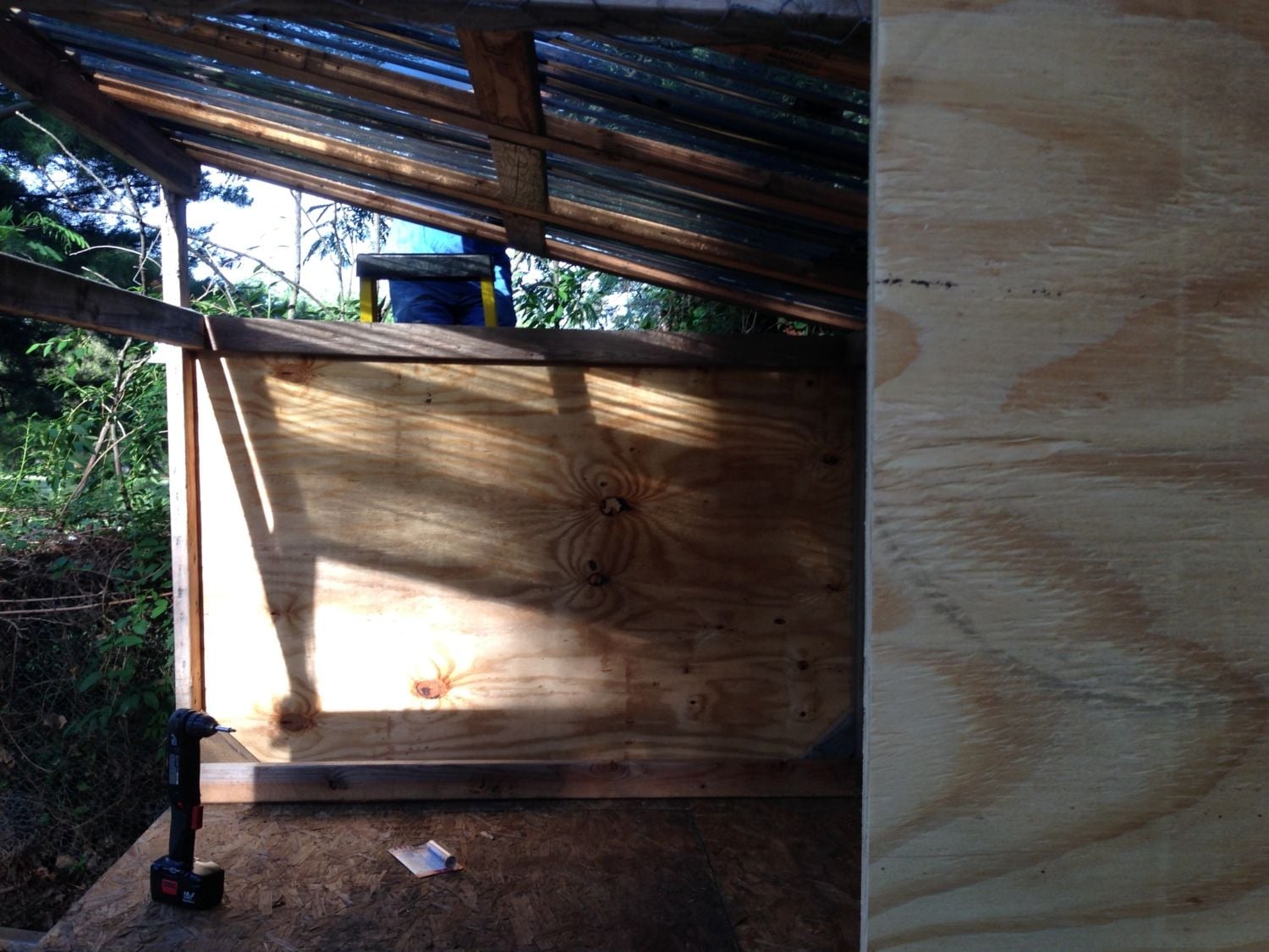 From a distance you can see it taking shape. The one piece of plywood is up and the second will be up soon, From there we have to work on the drawbridge like door.