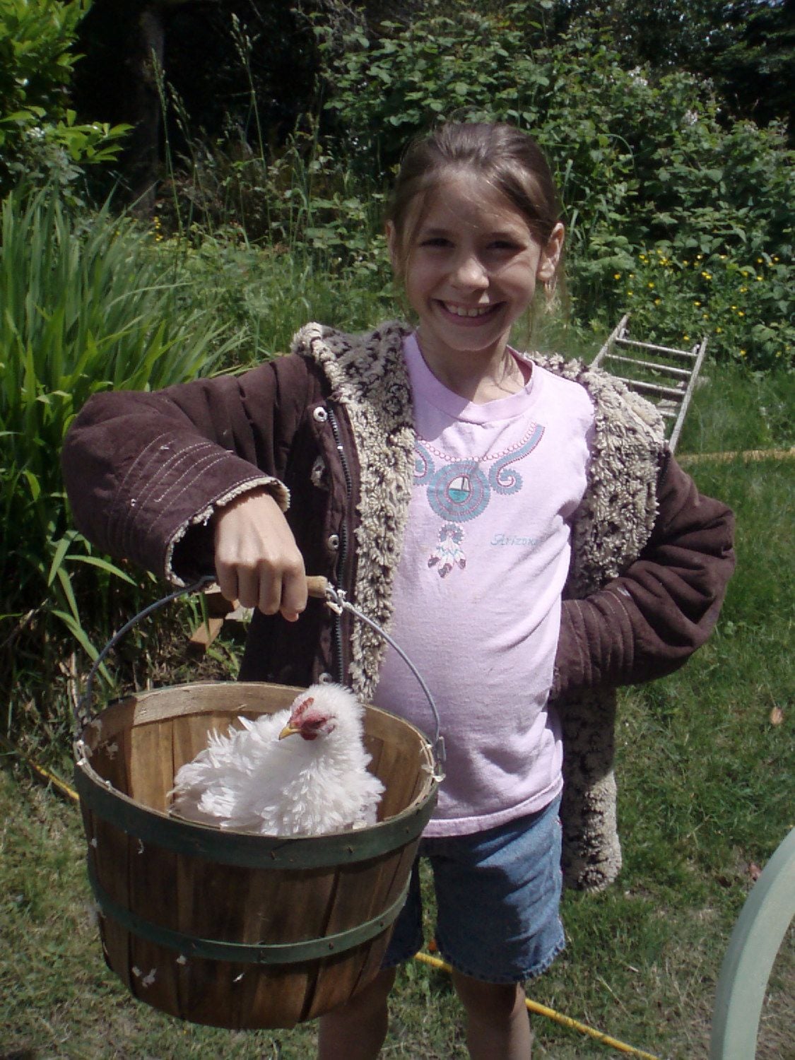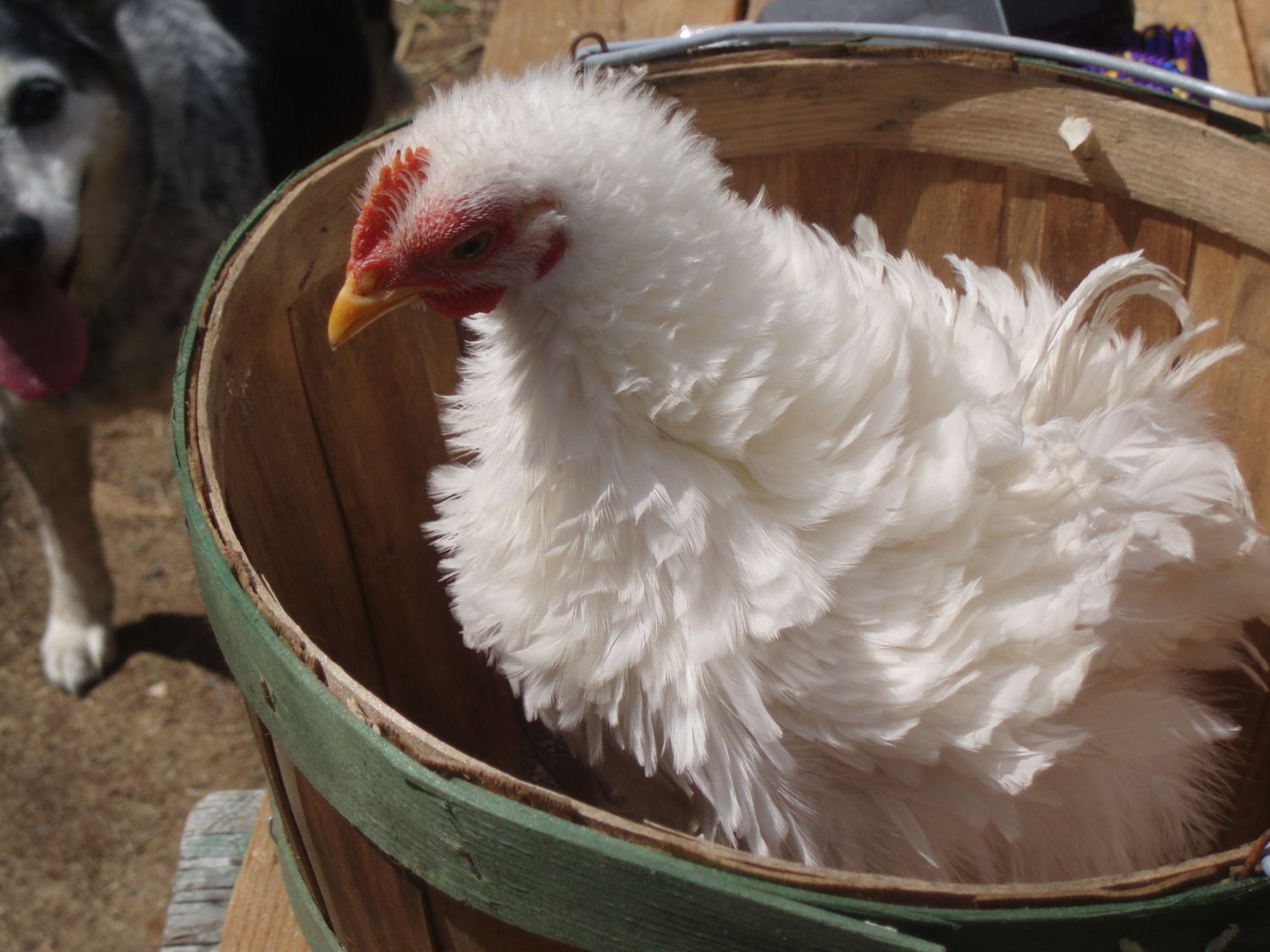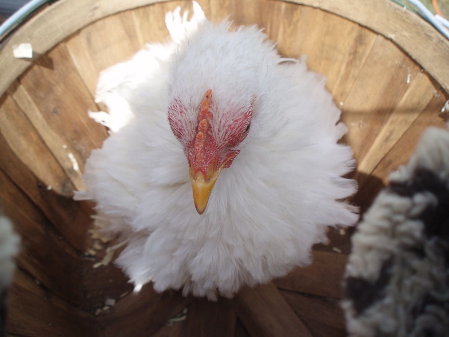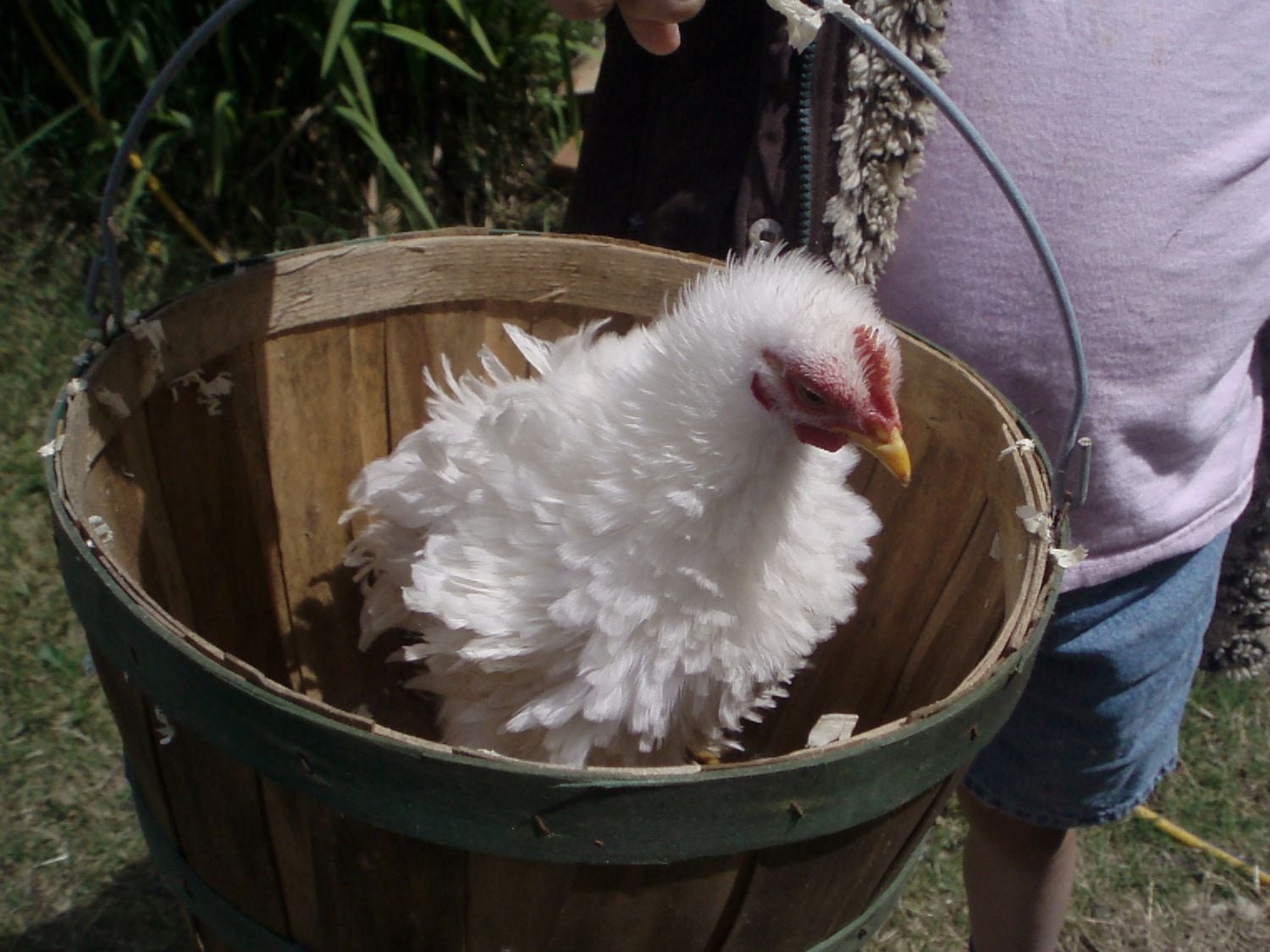 Thumbalina was a surprise to us. All three little Batoms looked the same and then this little frizzle emerged. She/He (we still are not sure how to tell) was so much smaller in the big ol' water trough with all the other chicken and duck babies. They seemed to grow but she just stayed so small. I know your not suppose to have favorites - but she's my favorite and she's such a love. She tolerates all the kids and being shown and all the practice of getting ready to show. People would ask if there was something wrong with her because her feathers didn't look right. We loved the Frizzle look so much we added a little black Frizzle named Tinkerbell. Tink is still under the heat lamp and waiting to grow before being added to the flock.