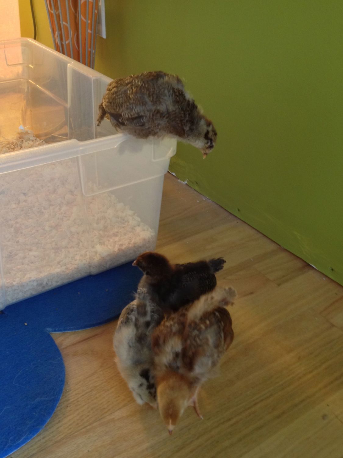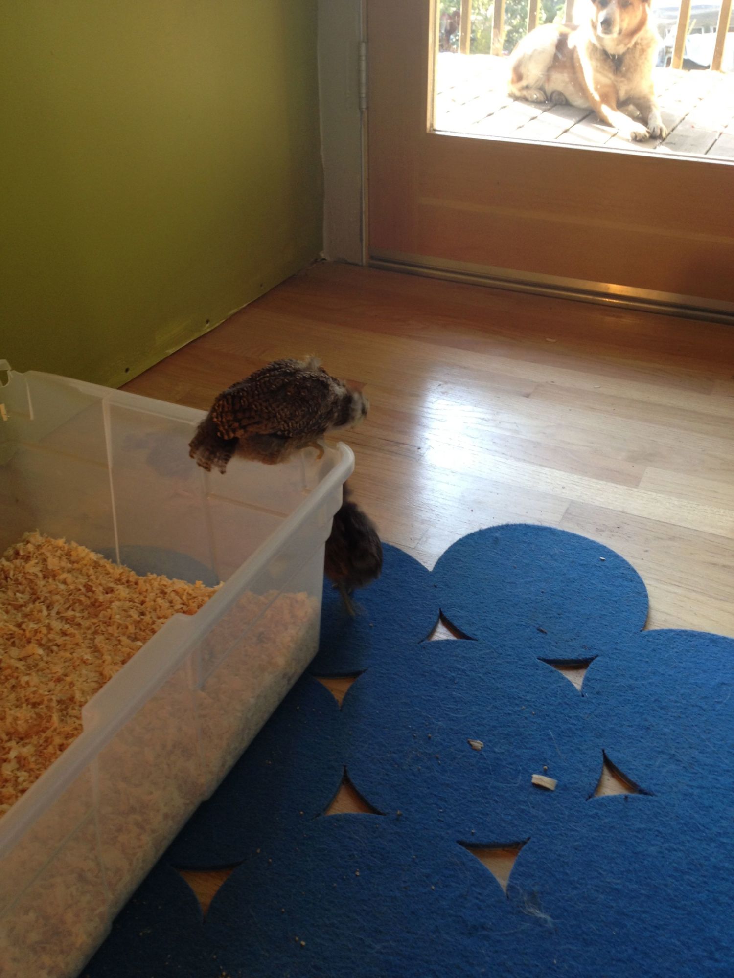 So, while Peregrin Chicken perches nervously on the edge of the brooder...a lookout, I am certain. Red, Baby White (aka the flyer) and her egg-mate, Grumpy Black, made a dash for the glass door.