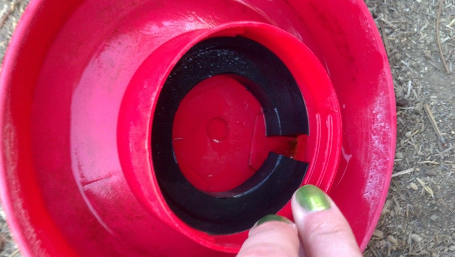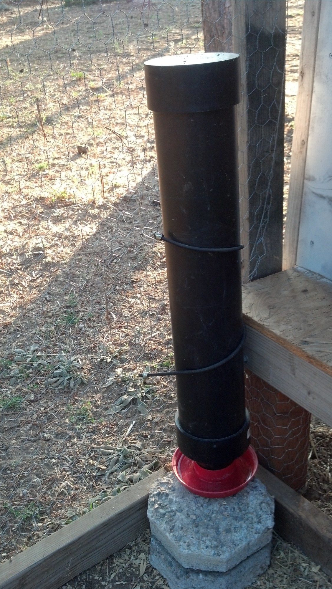 We only have 3 chickens and didnt want to get a large watering unit and they were still using the baby chick waterer and they were drinking that up in a day. So we reused the bottom from the baby chick waterer which has a 2 inch opening. You can pick up the bottom piece for about a $1.00 at most feed stores. I find this easier to keep clean and easy to clean with the smaller bottom. It's not really tippy either and as you can see I just used a few small bungees to hold in place just in case.