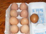 Light tan eggs on the left half side of carton and one LF Welsummer egg on the right side. See the comparison of egg colors.