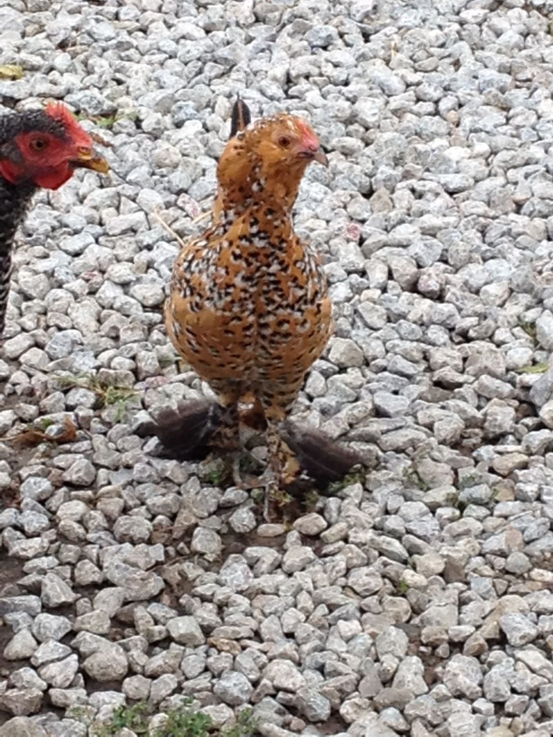 I am new here but part of what made me decide to join was the fact that we bought some Banty's from the local feed store this spring and I bought a couple fluffy cheeked chicks that the sales lady thought mite be Americauna's. I lost one due to a pile up from a burnt out heat lamp but the other little darling has matured into this hodge podge of colors and characteristics. So if any one has any ideas please let me know what she could be. She is very sweet and smart and comes running as soon as she hears us outside and knows her name which is appropriately Feathers. Appreciate any and all comments.