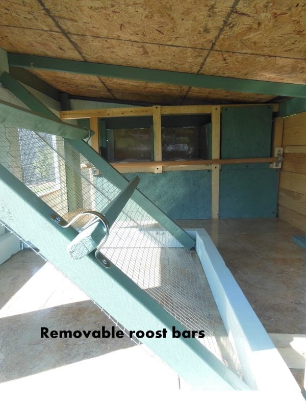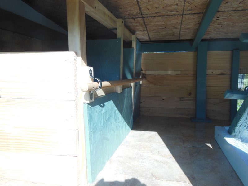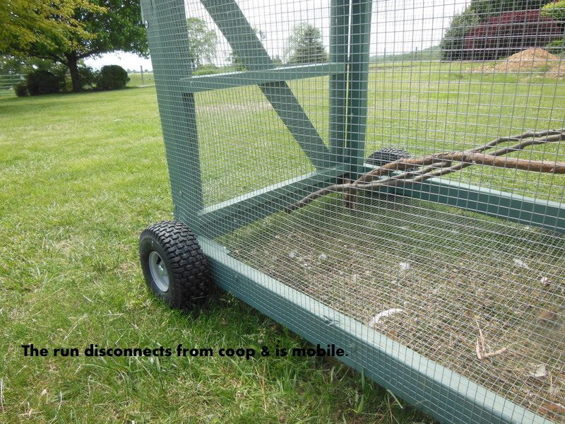 The coop is 5' x6' and the run is 3' by 8'. It currently houses 6 with a capacity of 8-10. I say 10 since the door to the run stays open in mild weather as it has hardware wire on all 6 sides. My chicks also get a few hours of free range time each day.