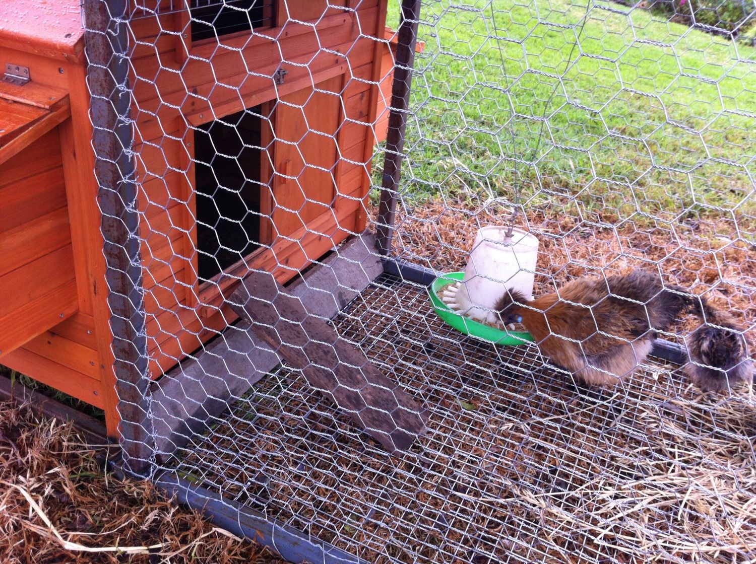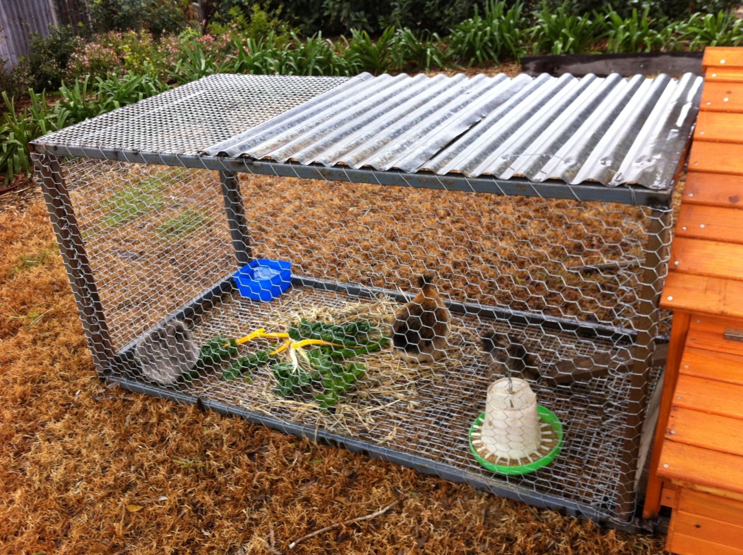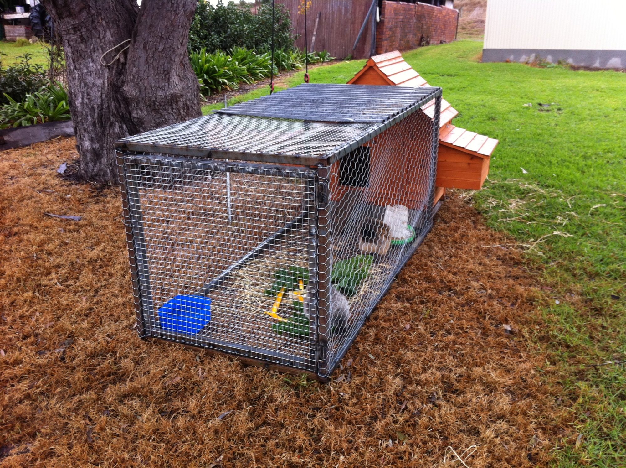 The frame is made of steel, the two sides with chicken wire, and the door, floor and half the top with some wire mesh, and the tin is some scrap corrugated iron. They seem to be happy chickens though!