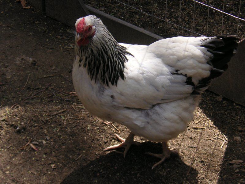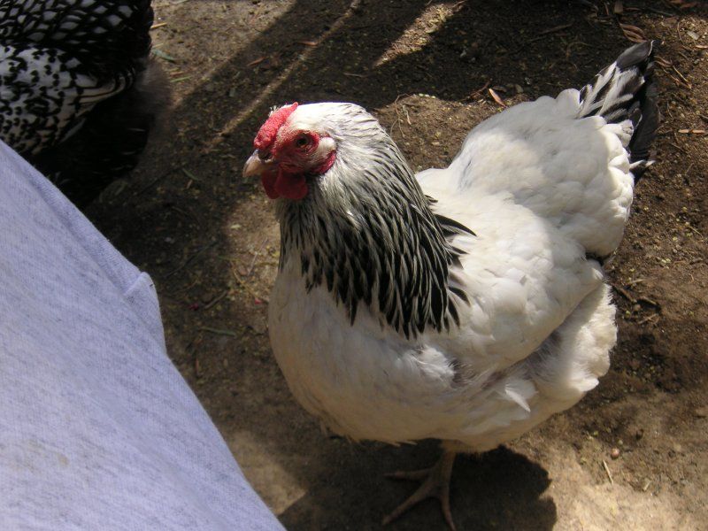 Wyandotte Columbian Created by Renee Breed Information, Comments, and Experience with breed: Columbian Wyandottes were developed by B. M. Briggs in 1893 and named after the Columbian Exposition in Chicago that took place the same year. He developed them from crossing Barred Rocks with White Wyandottes. Columbian Wyandottes have a white body with black tail feathers, wing tips, and black pencilled hackles. They do well confined or free-range. Like other Wyandottes, the Columbian colored bird is dual purpose, has a rose comb, and lays about 200 light brown or brown speckled eggs a year. The hens weigh about 6 pounds, and they do well in either hot or cold conditions. My Columbian Wyandotte hen is docile and sweet, a great cuddler. She loves to sit on my lap and have her head rubbed. She is quiet. She lays speckled brown eggs. |
