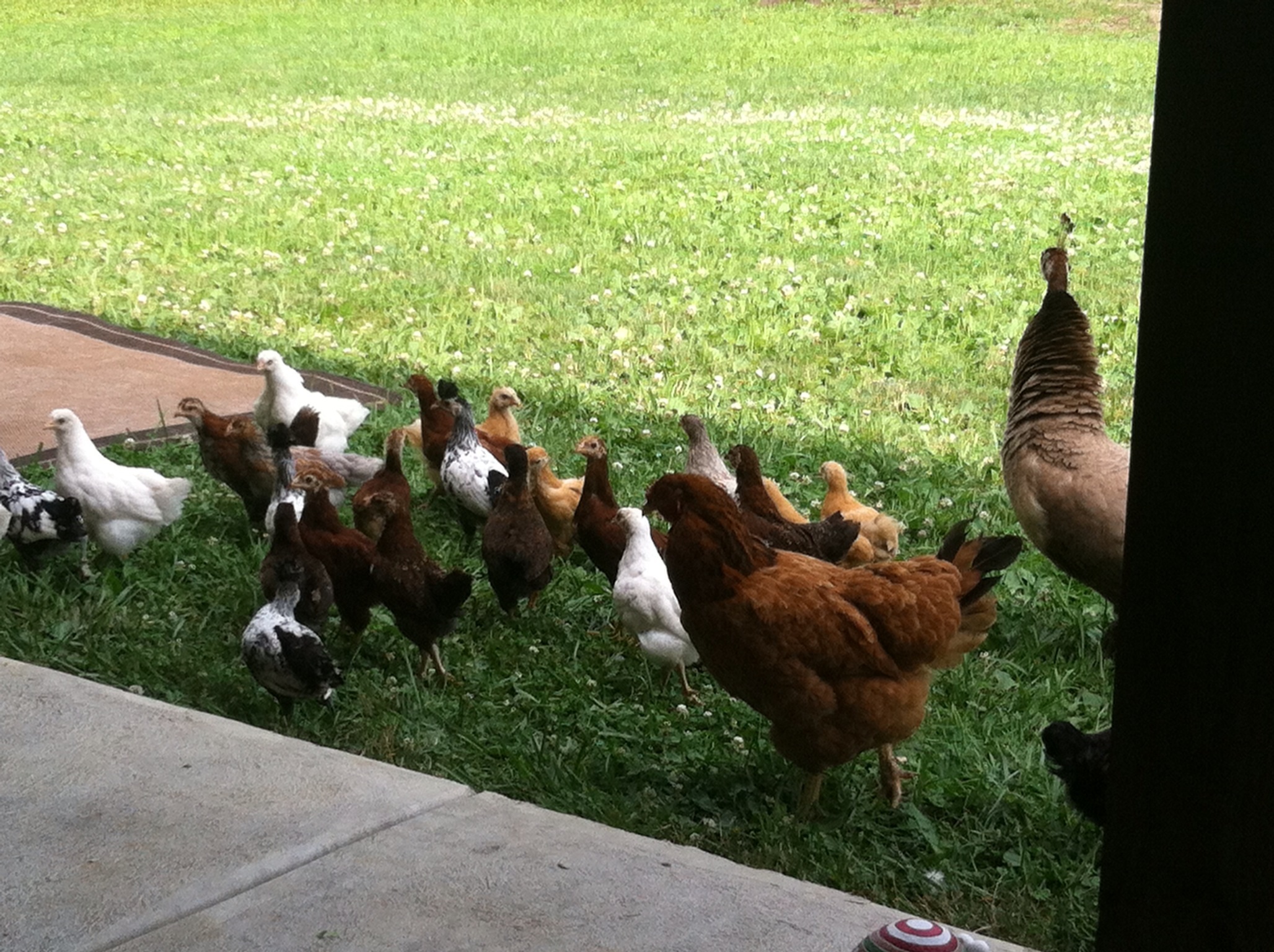 Peahen with adopted chicks
