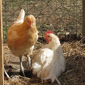 War chicken (mottled bantam cochin roo) and Taffy (lavender bantam cochin hen)