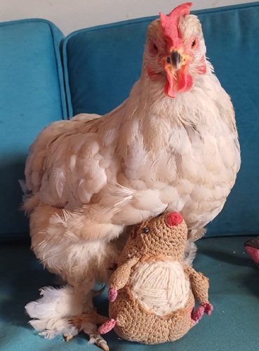 Hi! I'm a big chicken lover. The fluffy creature you see on my profile pic is Suzi with a hand made brown plushie called Mollis peaking out from underneath her