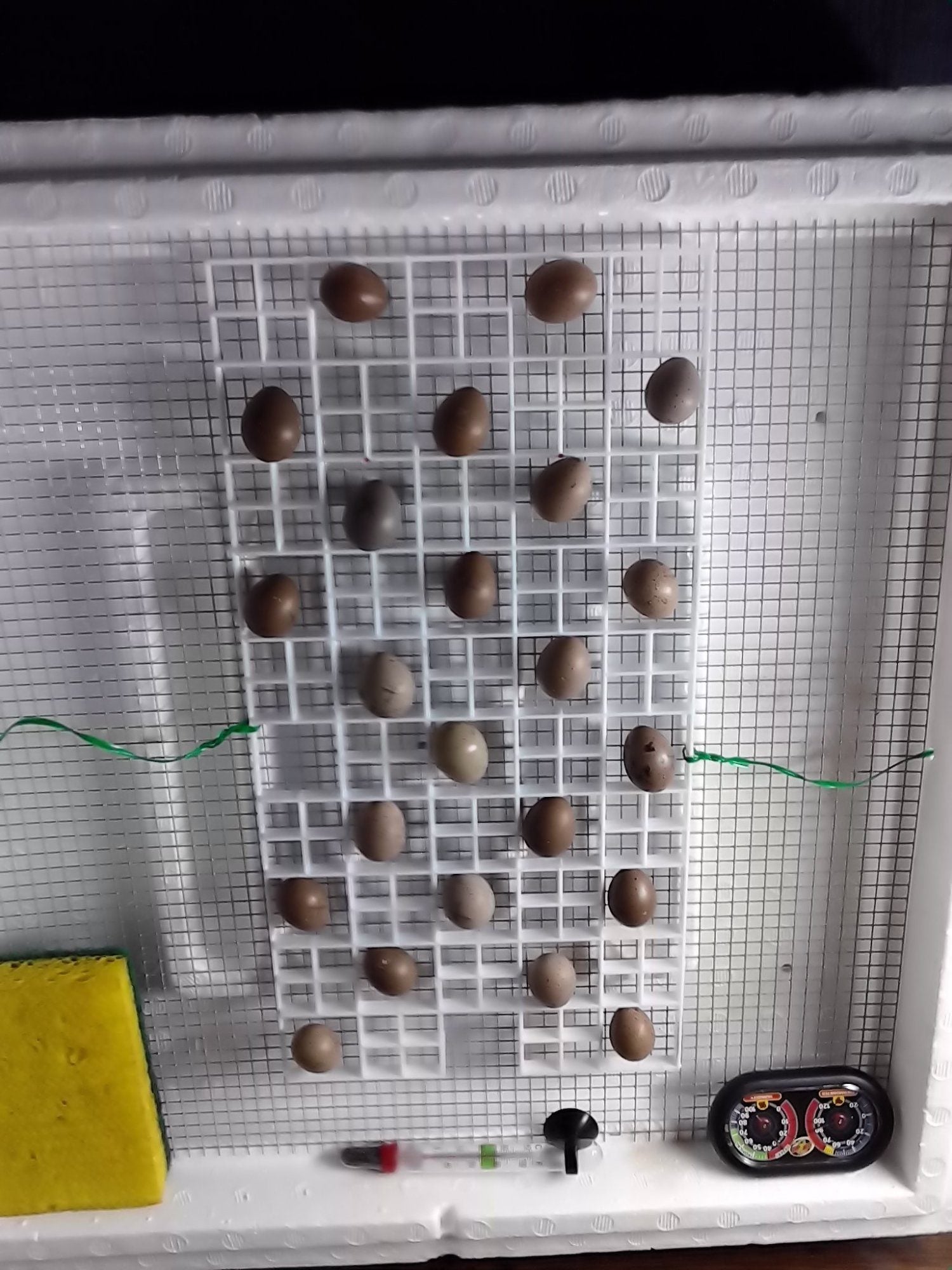 Next I placed my eggs to be incubated in the inside my rack(I mean the rack).Closed the bator and took my egg turner for a test drive. Here it is all connected inside with my itty bitty eggs.![]()