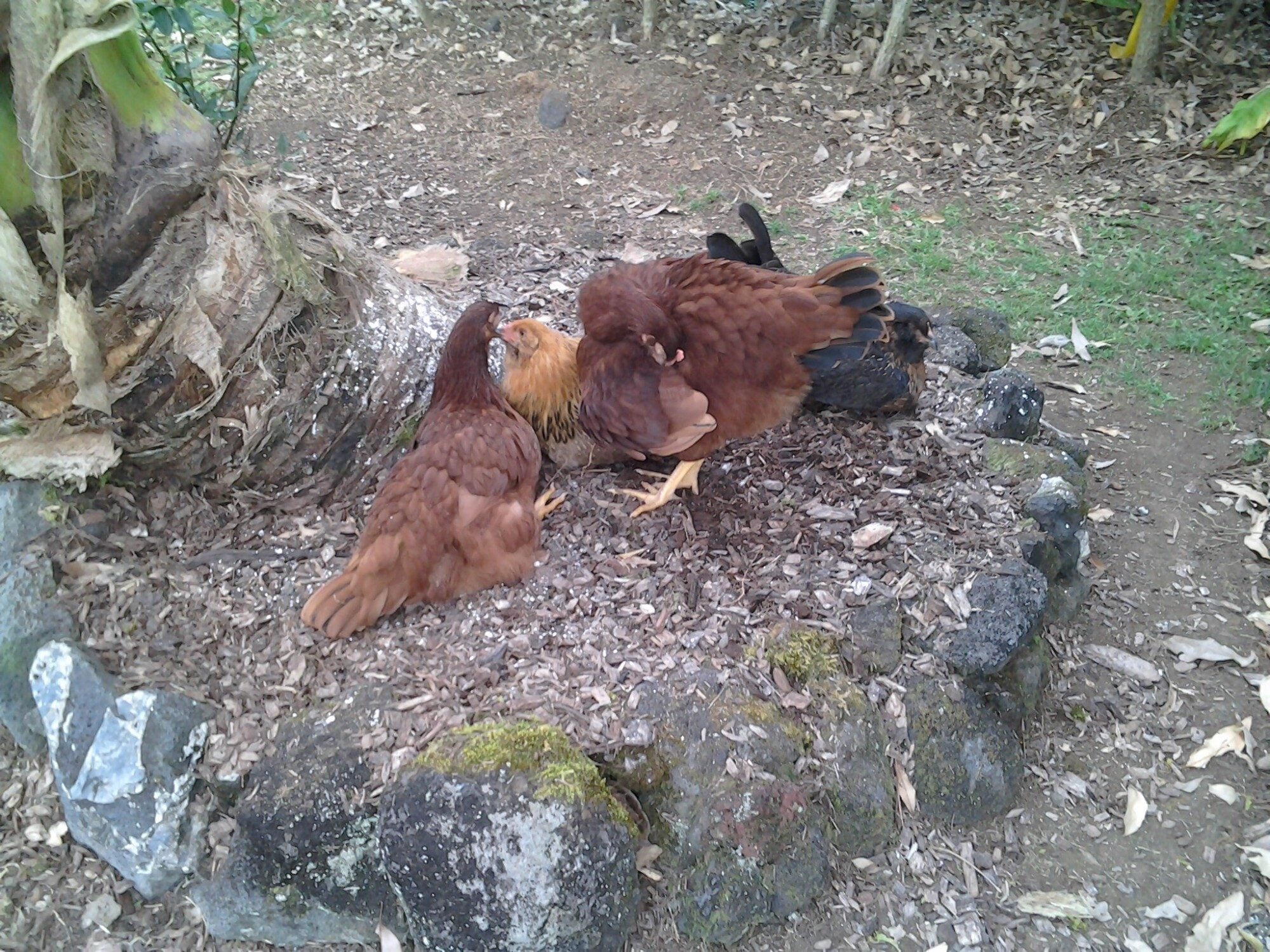 I think these two in the foreground are hens. Daisy in the background is my oldest, my sweetest and my best layer right now. Unfortunately, all the others are skittish.