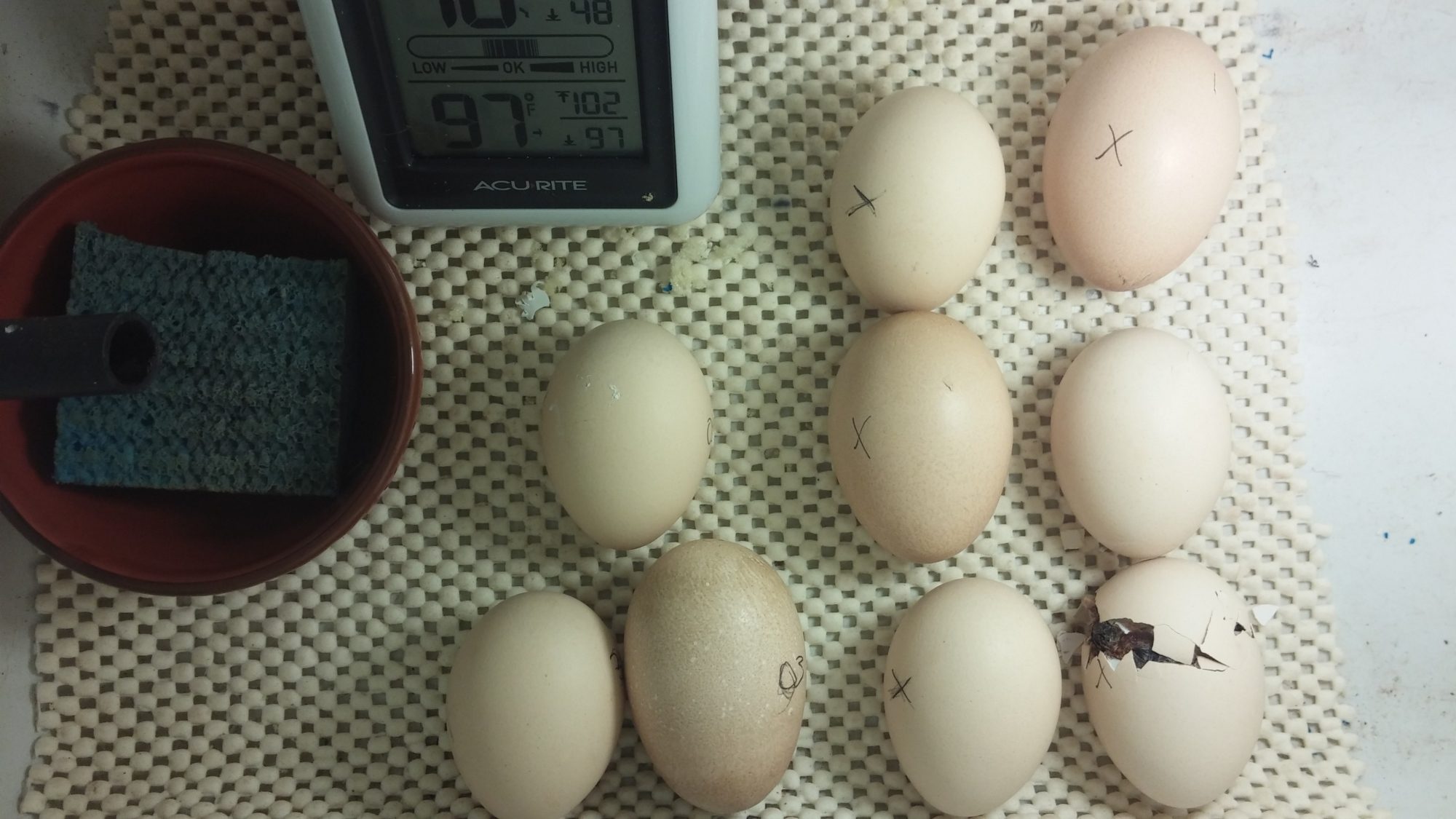 This was my first time making a incubator and first time incubating my own eggs and I'm so proud they all hatched, all 9. I can say for the most part my little non fancy ice cooler incubator with only a fan and bulb in it stayed pretty consistent at 99 to 100 degrees except for a few times when the temp in that room changed it went as high as 104 and as low as 95 a few times and I was sure they were all dead but waited it out. everyone hatched healthy and right on time days 21 and 22. The only thing I will need to change for this next round is on day 18 raise the humidity to over 75%. I kept it around 65 and I had a chick get stuck to his egg cause it wasn't humid enough and I had to give him a warm bath to get the dried egg shells and goop off him. I did not do much for them didn't put in any fancy equipment our go all out on my bator. I didn't even worry about the humidity I did a dry batch turned them 3 to 5 times a day a quarter of a turn. I figured the eggs are outside in nature the mom's don't worry what times or how many times they turn there babies, there exposed to all kinds of temp changes and they hatch inn nature just fine. I will be putting in another batch in a few days along with a couple duck eggs.