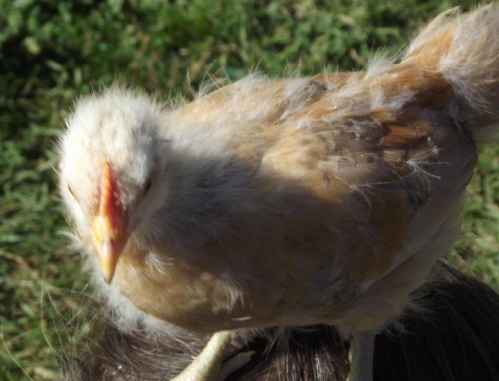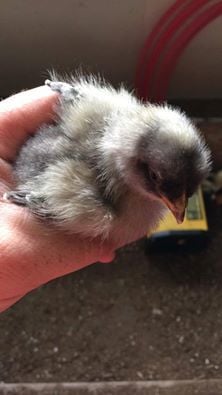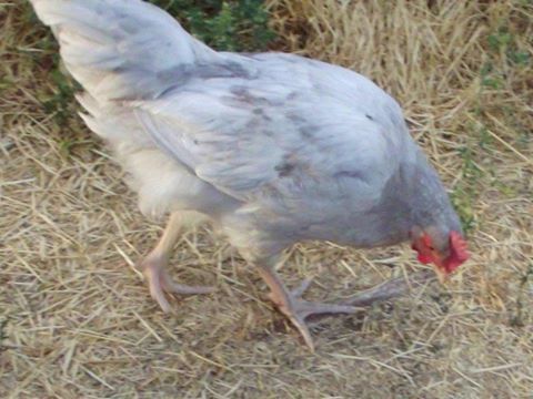 I LOVE the color or your EE/Orpington pullet, American Mom. I'm trying for something similar. This is the cockerel my friend hatched out under her broody girl for me last fall. The mother was Barred Rock and the father the rooster whose picture I posted above. I just loved the blue and white barring, but unfortunately the chick died at just 8 weeks old. We think my friend's Jersey Giant jumped on top of him in the nesting box and crushed him during the night. He was sooo pretty. I adore the blue and white combo. I realize a hen from such a coupling won't have this coloring, due to the genetics of only males inheriting the barring from a Barred Rock, when the rooster is a solid colored male, but at least I got to enjoy the cockerel's looks for 8 weeks.![]()