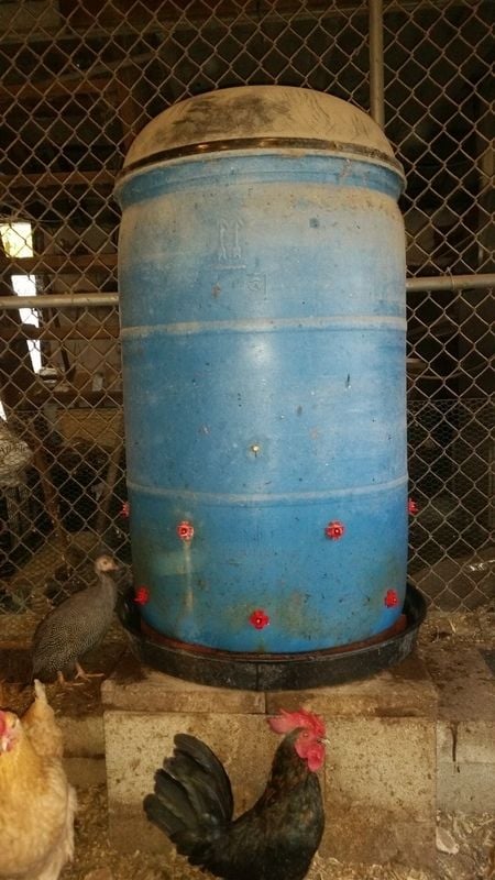 I'm thinking of doing a rain barrel design that catches from the gutter off the back side of the roof. I'm going to lay the barrel like the picture below but build a stand to butt the barrel almost to the roof with a clear plastic corrugated roof overtop to let light in, I will box in to prevent chickens from roosting on top as well. The system will look identical to the one shown here EXCEPT it will only be one barrel and I will attach a hose that will go into a bucket, the bucket will have the water bell attachment for the chickens. the reason I am doing it this way is I have a 5 gal bucket heater. I don't want to heat the rain barrel all winter to prevent from freezing, but I don't mind keeping the 5 gal bucket thawed and during extreme cold (keep in mind I'm in VA which never gets "extreme" cold) I will just fill the bucket from the house or use a rubber tub for temporary purposes.