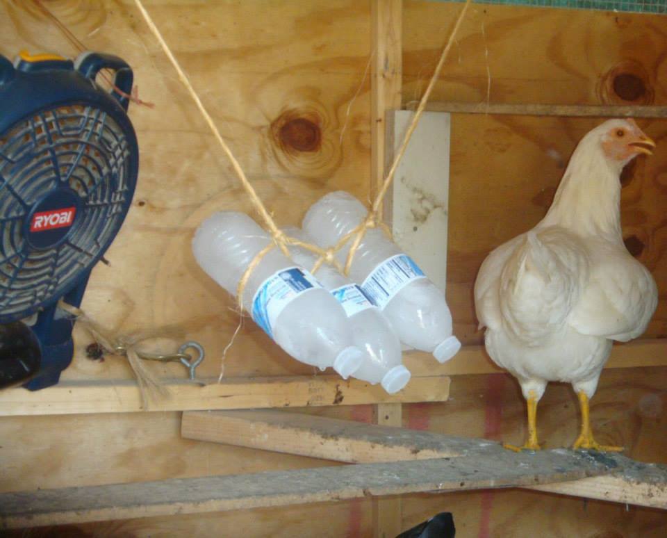This is my routine. I have a fan pointed at the nests for the layers. I have a fan moving the air in the coop. I put ice in all the water. Lots. And I have 30+ chickens. I also run a hose some days on the ground for a few hours and they do walk in the puddle and stop panting. I have also kept a basin of water and had to dunk a chicken now and then. One would stay in there without force. But it sure cooled them off. The mist fans didn't work for me because of the humidity in Florida. I currently have 2 fans going right now, but have 5 fans total. They mostly run all summer. I pay about $30-$40 on Amazon for fans that work better than box fans.
