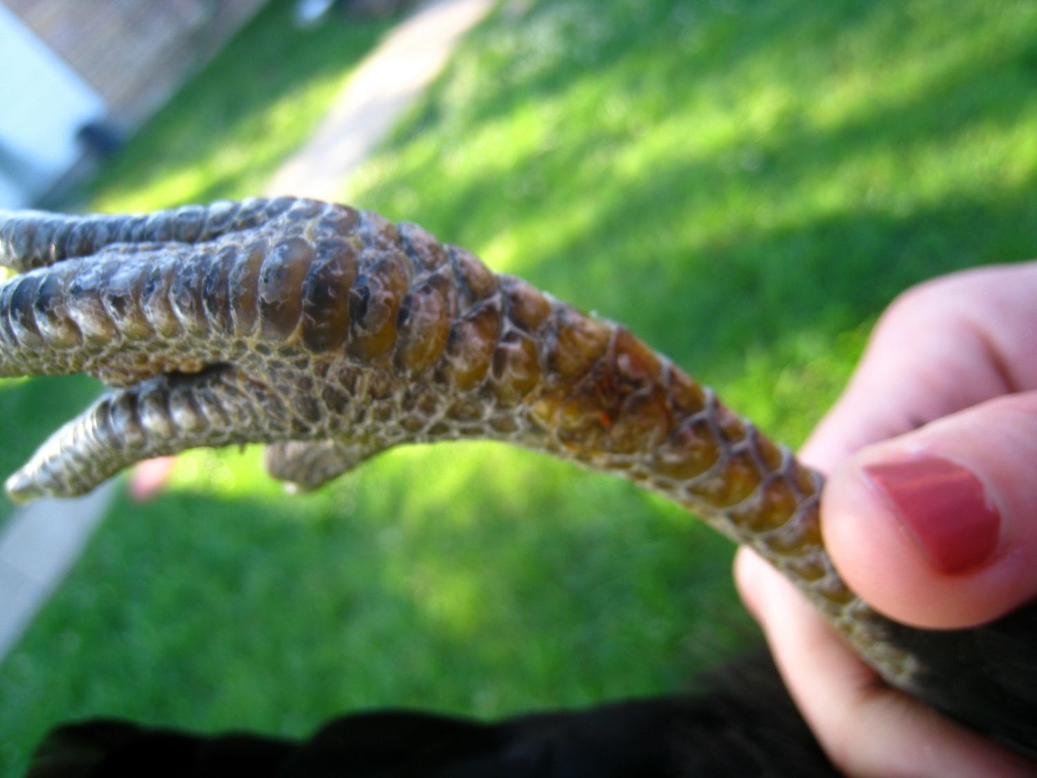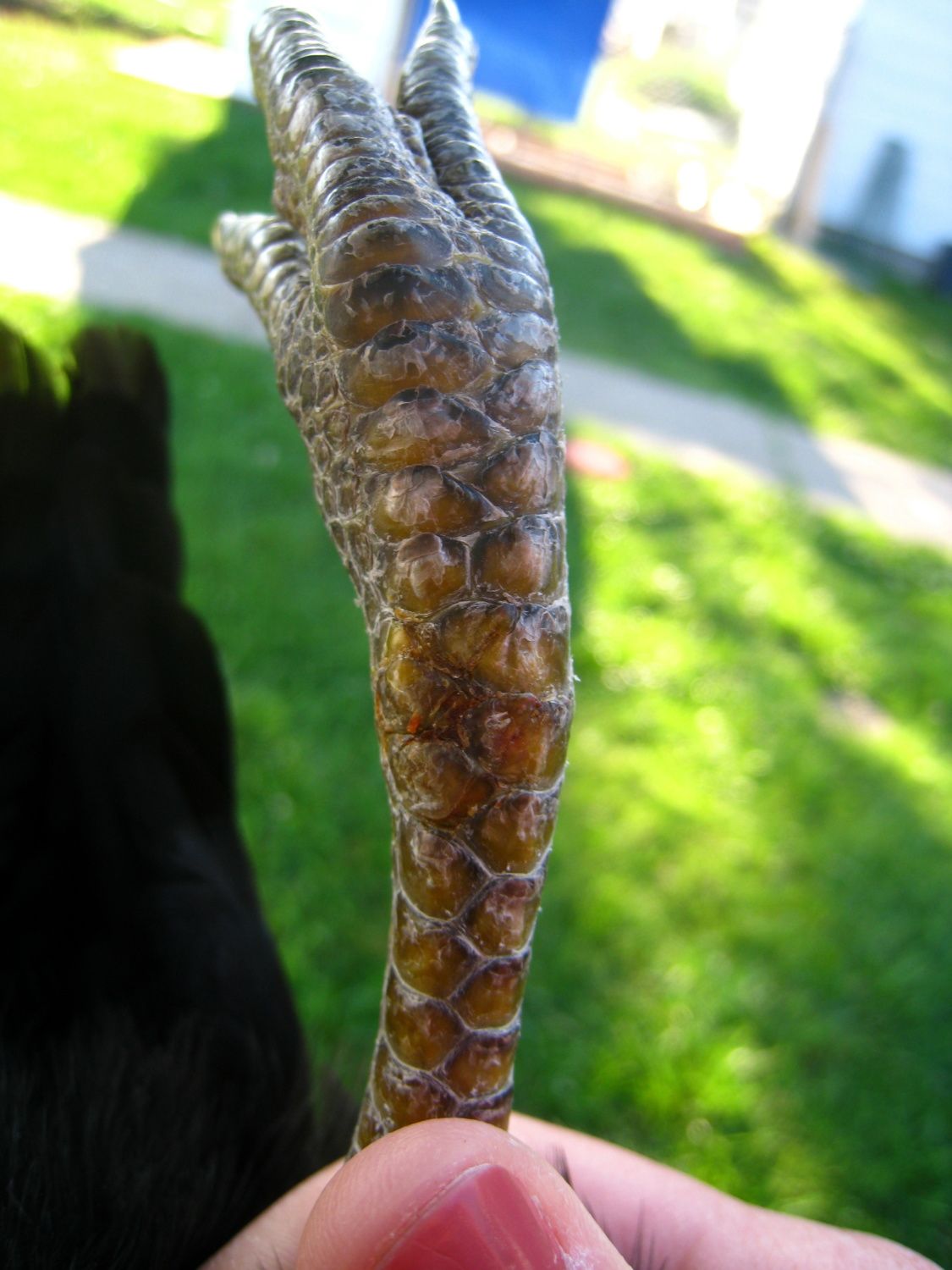 We think she got it stuck in the fencing or something. The chickens are in a coop and run overnight.
