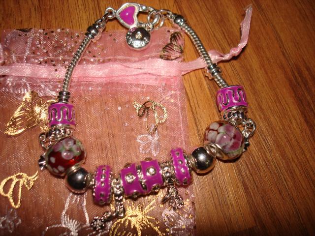 13 bead Pandora Charm Bracelet! 4 charms, 2 silver spacer beads, 5 large pink beads, 2 glass beads!! Cut heart lock clasp and pandora charm on ends. Great deal! Comes in cute gift bag. Click on pic to make bigger.