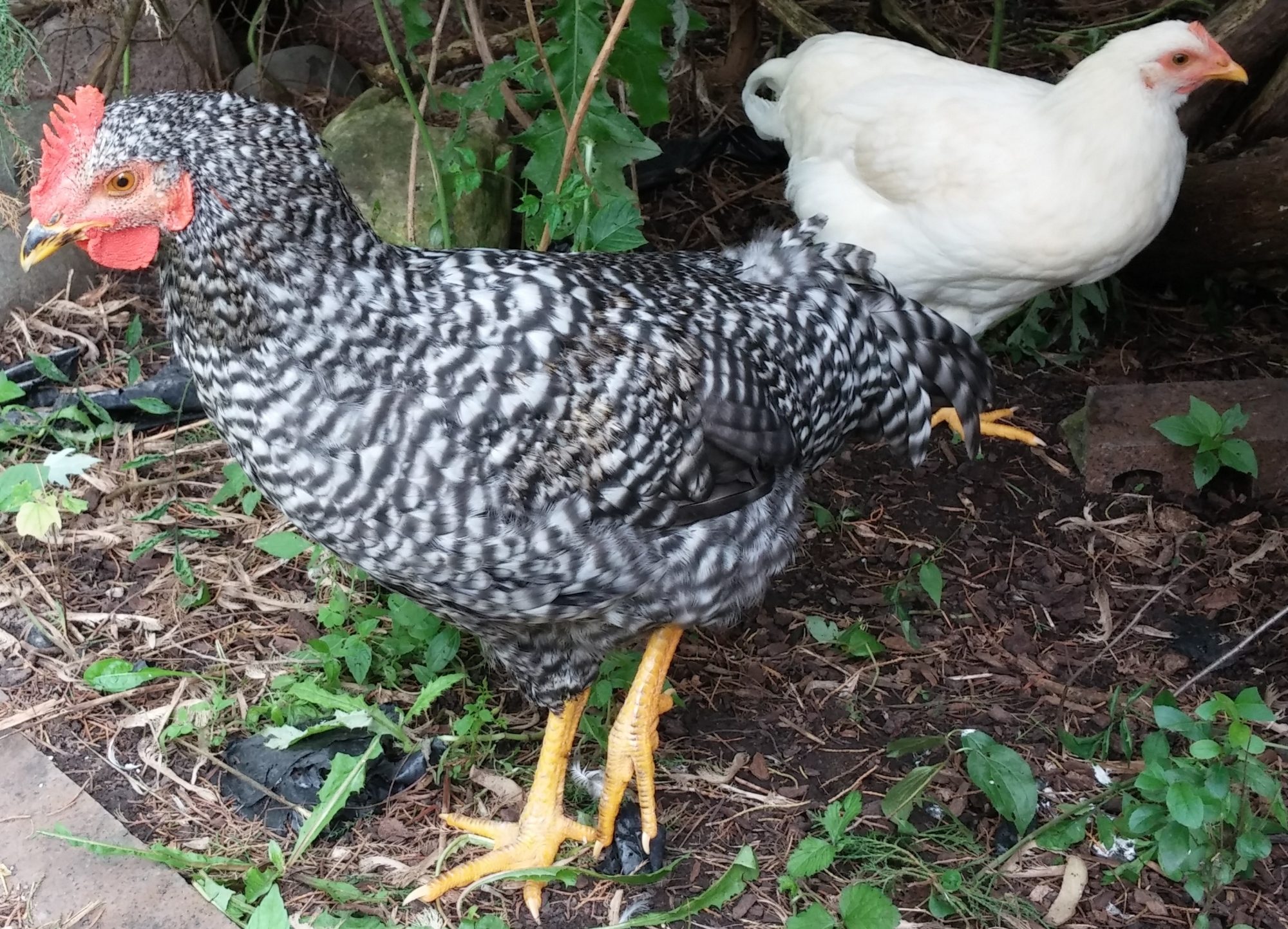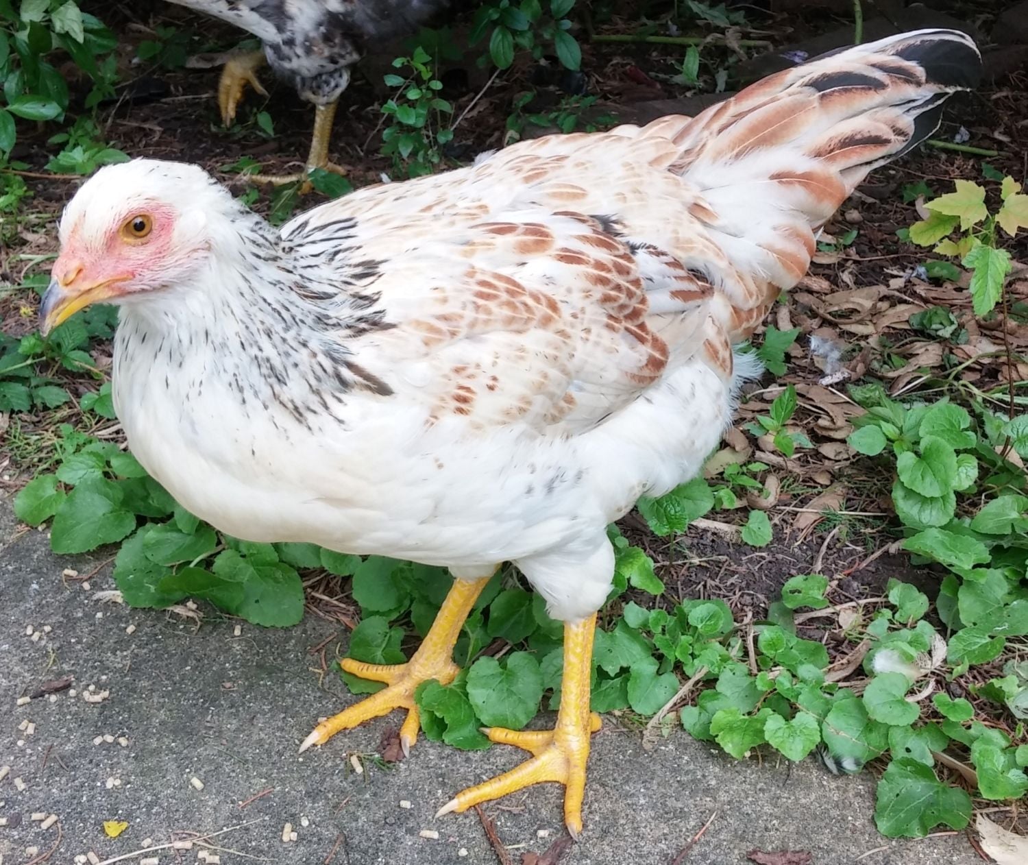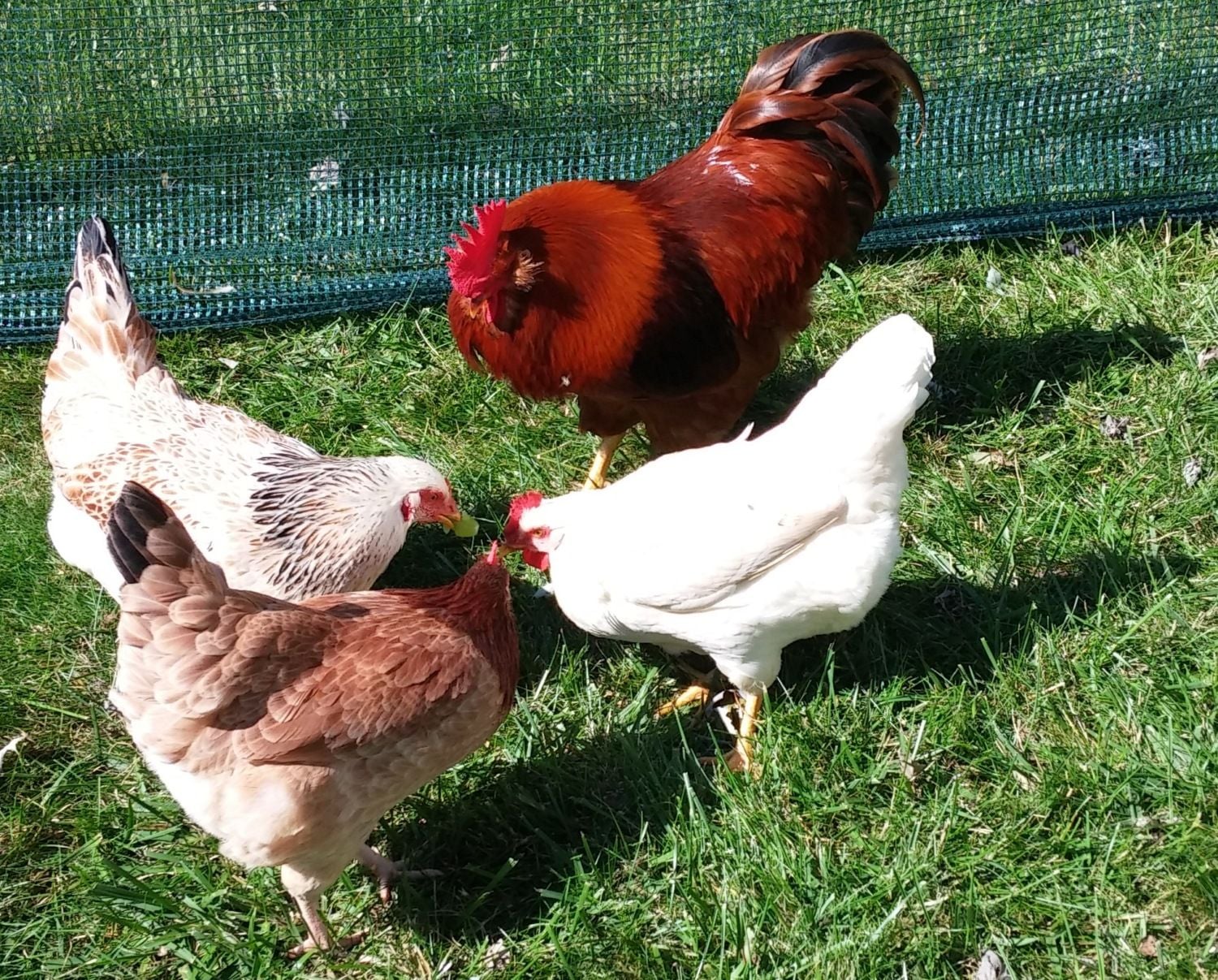 [COLOR=0000CD]Here's a 25-week update:[/COLOR] Everyone was correct about Goldie, Sparky and Ben being cockerels. I still have Goldie but the other 2 were re-homed. Here is a current picture of Goldie: Of the 3 girls, Yellow (the white one) started laying eggs in week 20 and has only missed 1 day since (she is our little egg factory). The other 2 girls are both letting Goldie do his thing, but neither of them have given us an egg yet (freeloaders). Here they are discussing what a stud Goldie is. Either that, or Yellow is telling them how much it hurts when she pops an egg out. LOL They are such fun and make me giggle all the time.