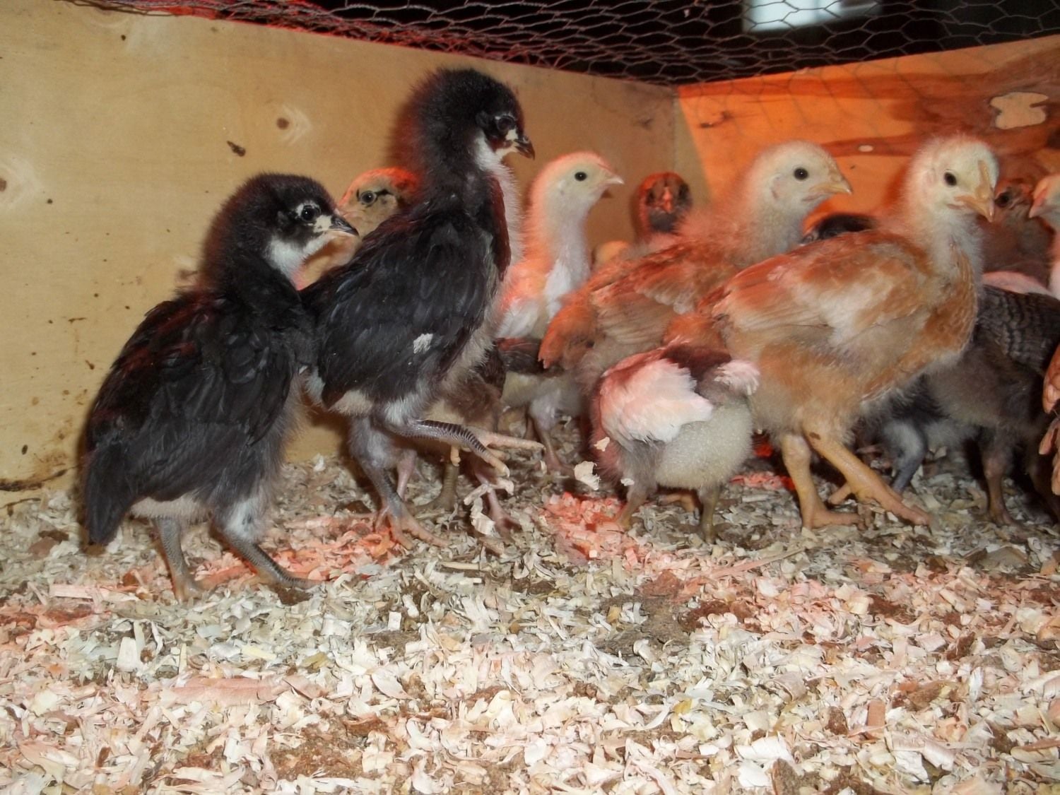 x2The yellow chicks that are turning white may be white leghorns. The black chicks look like australorps. The "not EE" looks like an easter egger to me. The gray chicks that are feathering in white are probably white rocks.