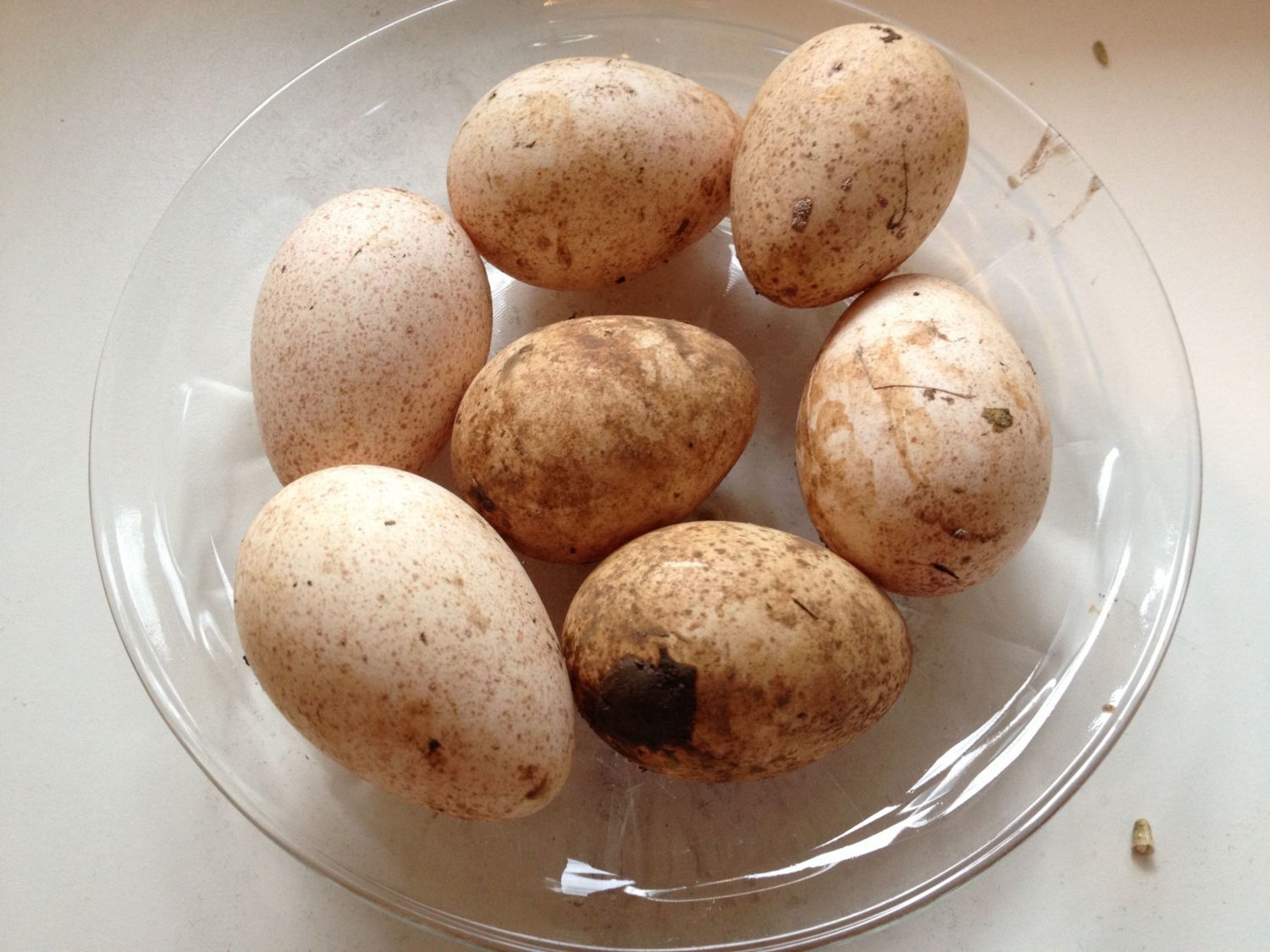 Actually, it was Nelson who found them and he found 7! How did he find them? We "lost" one of our turkeys this morning ... one of the hens ... and Nelson and I were tearing around the yard looking for her (worried that maybe someone had come here to do their shopping for Thanksgiving dinner!!!) I was on the far side of the duck run when Nelson told me to come running. Where? Where? It was raining and I had a waterproof poncho on and I couldn't see or hear very well. It was wet and my shoes are 3 sizes to big and I was trying to skate/shuffle in the direction where I thought he might be. I found him over by the house holding 3 turkey eggs in his hand! There was a despondent looking hen trailing behind him. We went and poked around a bit more and found 4 more eggs. Clearly they know something is up and are upping their ante in their bid to be "keepers." But, sadly, these darlings can't say; they are the wrong breed.