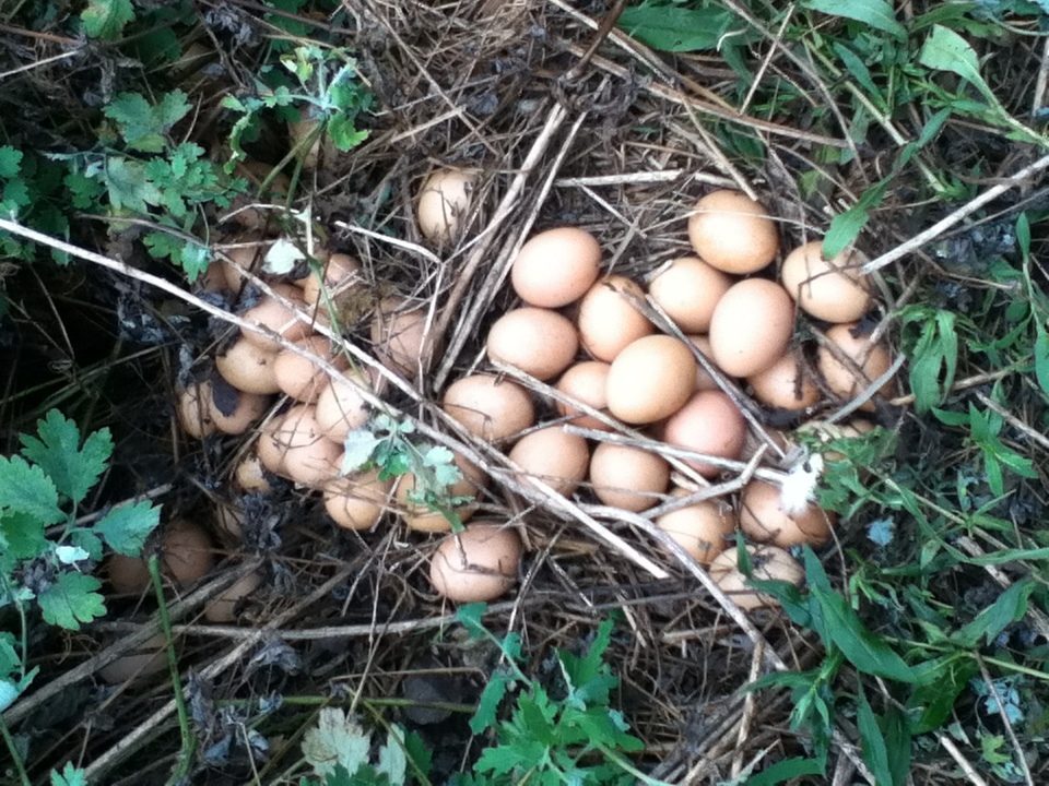 So tonight we get home from work just to pick up a couple things before heading over to my parent's for mom's b-day. I noticed that the horse fence was off a couple step in posts. Horses spent the day inside out of the heat, but didn't want to deal with it in the dark when we got home. So I go hook the fenceline up and come back up the hill to get going. As I am walking past the chicken run/pasture, I notice a strange pile of rocks. I go back to look. Imagine my surprise/disgust at finding a huge pile of eggs that were hidden in the weeds. I've done walk throughs before, but not over to that spot. And I've been watching the girls for squatting (none), haven't heard egg songs, couple combs have gotten bigger/pink, but not bright red. I did a quick egg count from what I could see on top of the dirt. 50... I've been waiting to see my first egg and I find a pile of 50... No clue how old they are and we have had some hot humid days, so first thing tomorrow morning I get to go bag up 50+ beautiful brown eggs to toss in the garbage (which thankfully picks up tomorrow).