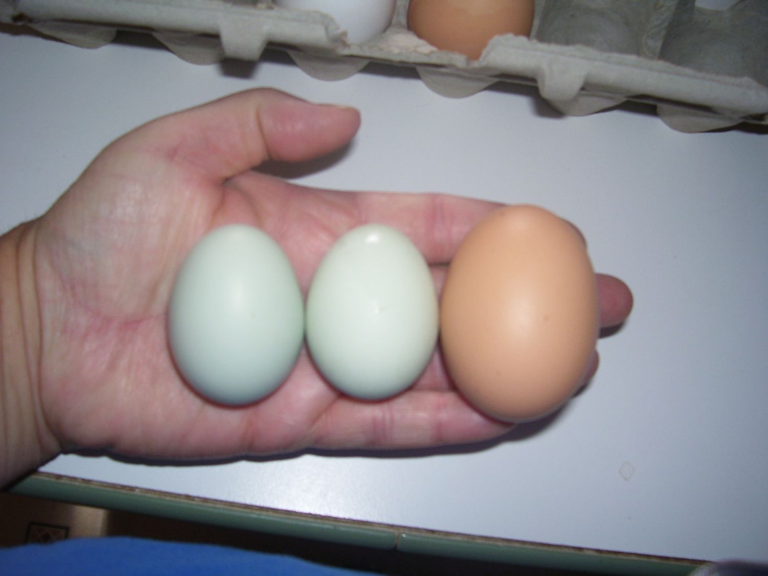 The first two easter egger eggs, on the right an egg from one of my red star hens, just for size comparison.
