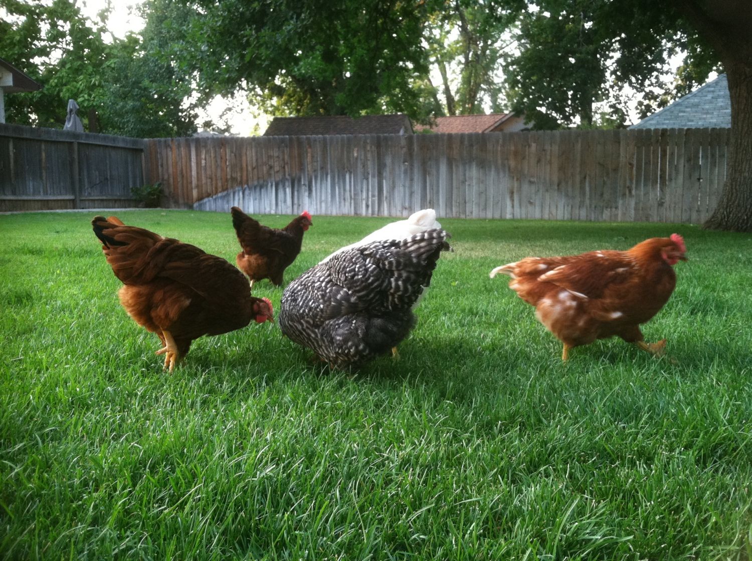 I was working in the yard today and heard some clucking behind a shed that backs right up to our property line, in a panic i thought one or a few of the girls had scaled the fence while i was mowing, I raced back there and didn't see anybody?? on second look, just inside the fence i saw three girls the two gold sex links "Frankie & "Francine" and "Betty White" one of the Amber Whites wedged behind the shed all sitting on top of each other in a make shift nest of old oak leaves(I've never seen them back there ever) what a site! they sat back there clucking and carrying on for a while but no eggs! Betty acted strange went into the coop and sat in the nest boxes for an hour during dinner, I was absolutely convinced she was going to pop out an egg...just as Frankie last Sat she was acting weird kinda stunned tail down for about an hour i figured in "labor" but then suddenly popped out of it and started pecking around the yard like everyone else.....I'd have bet money on an egg today but maybe tomorrow...