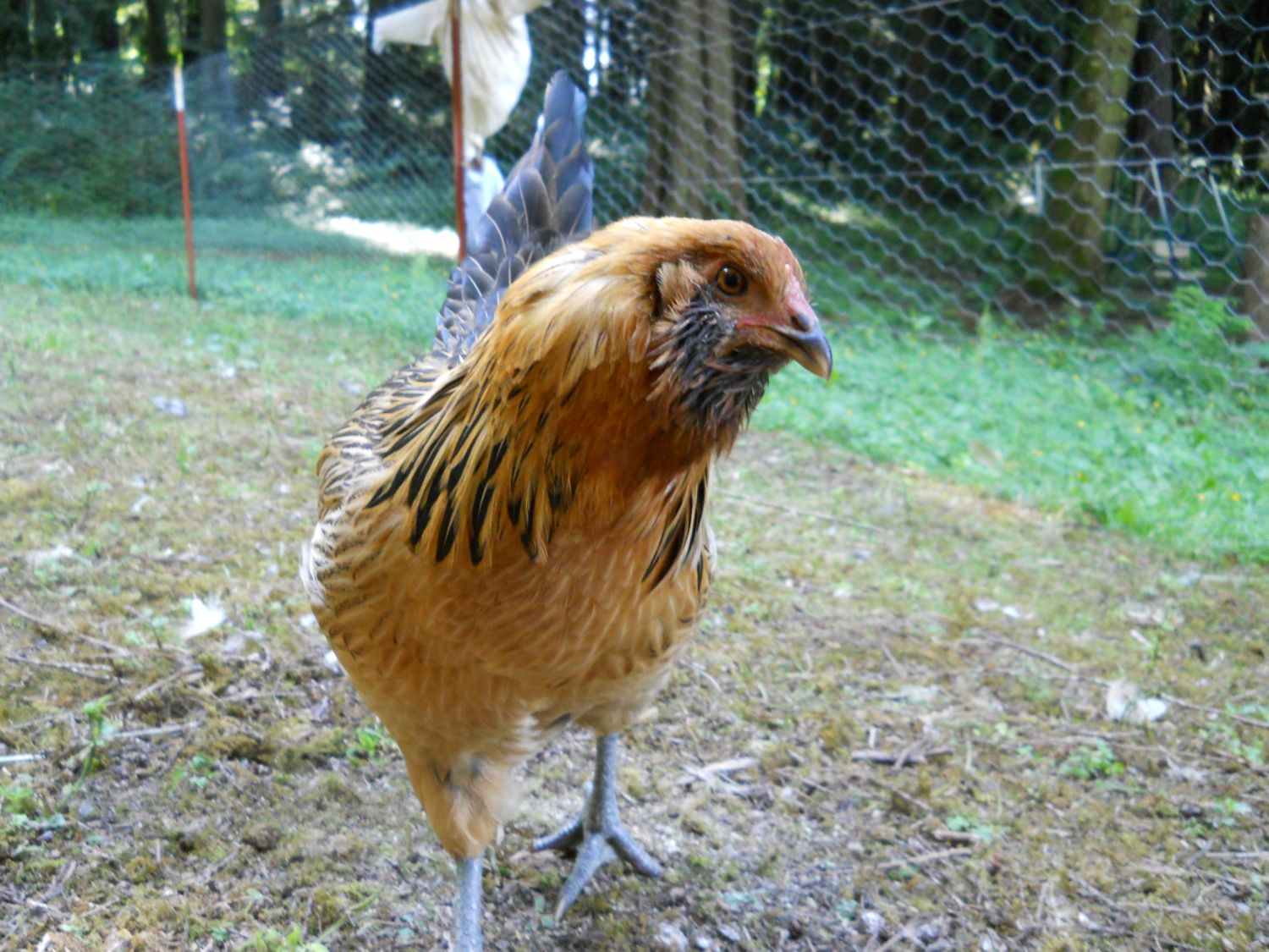 Clementine- 19 week Buff Orphington whos been squatting for a week, sings the egg song, has a full range of vocals, and was the first to get a bright red face and comb although its a bit small still.