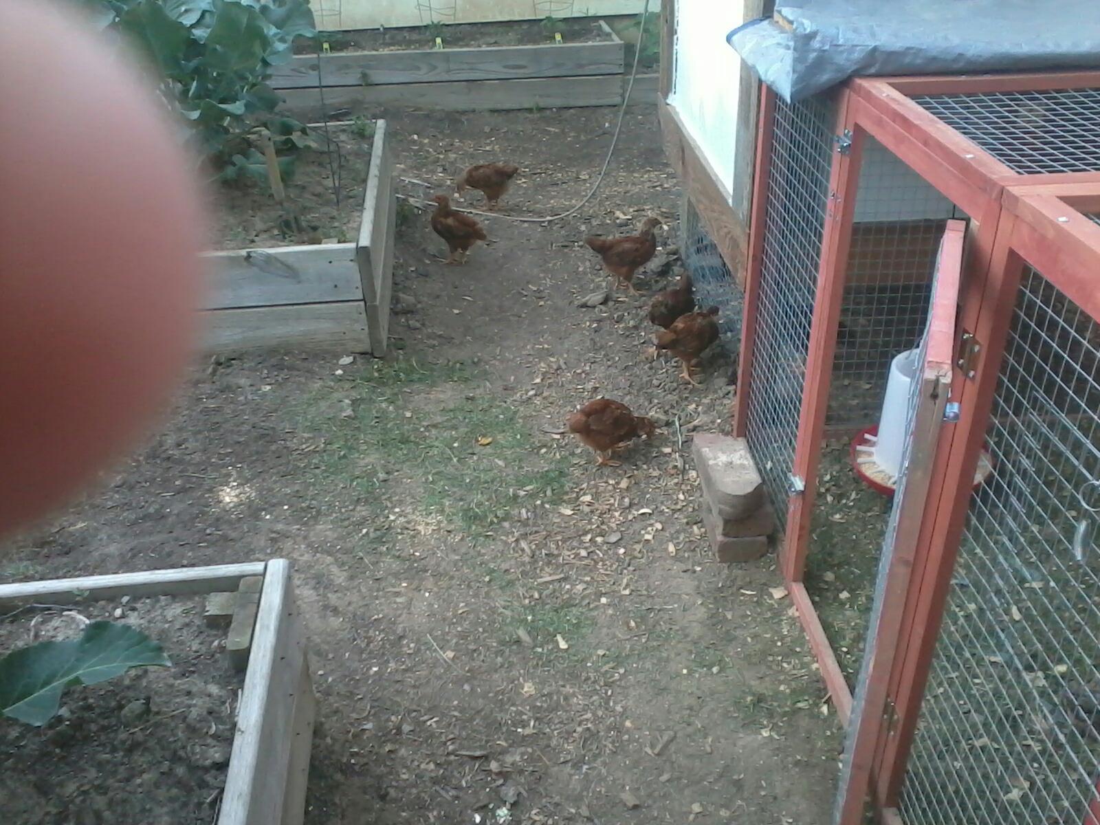 Here's a pic of my 7 RIR outside of their coop and run for the 1st time.. They ran around the garden for over a hour..