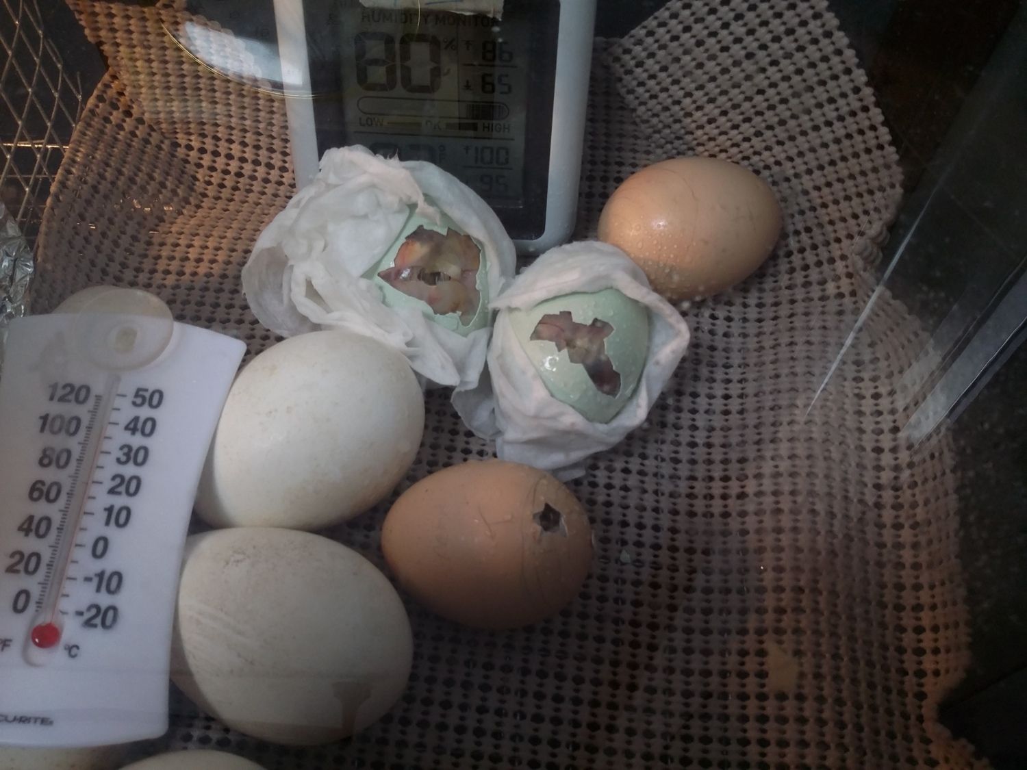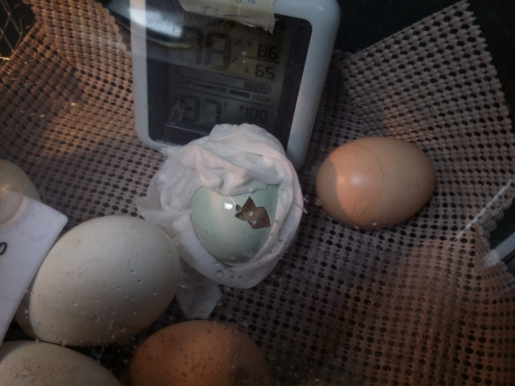 in case anyone else runs into this, i read, and re-read, and read again, the assisted hatching guide on this page. humidity was cranked to 70% and as high as 90% for a few minutes once.