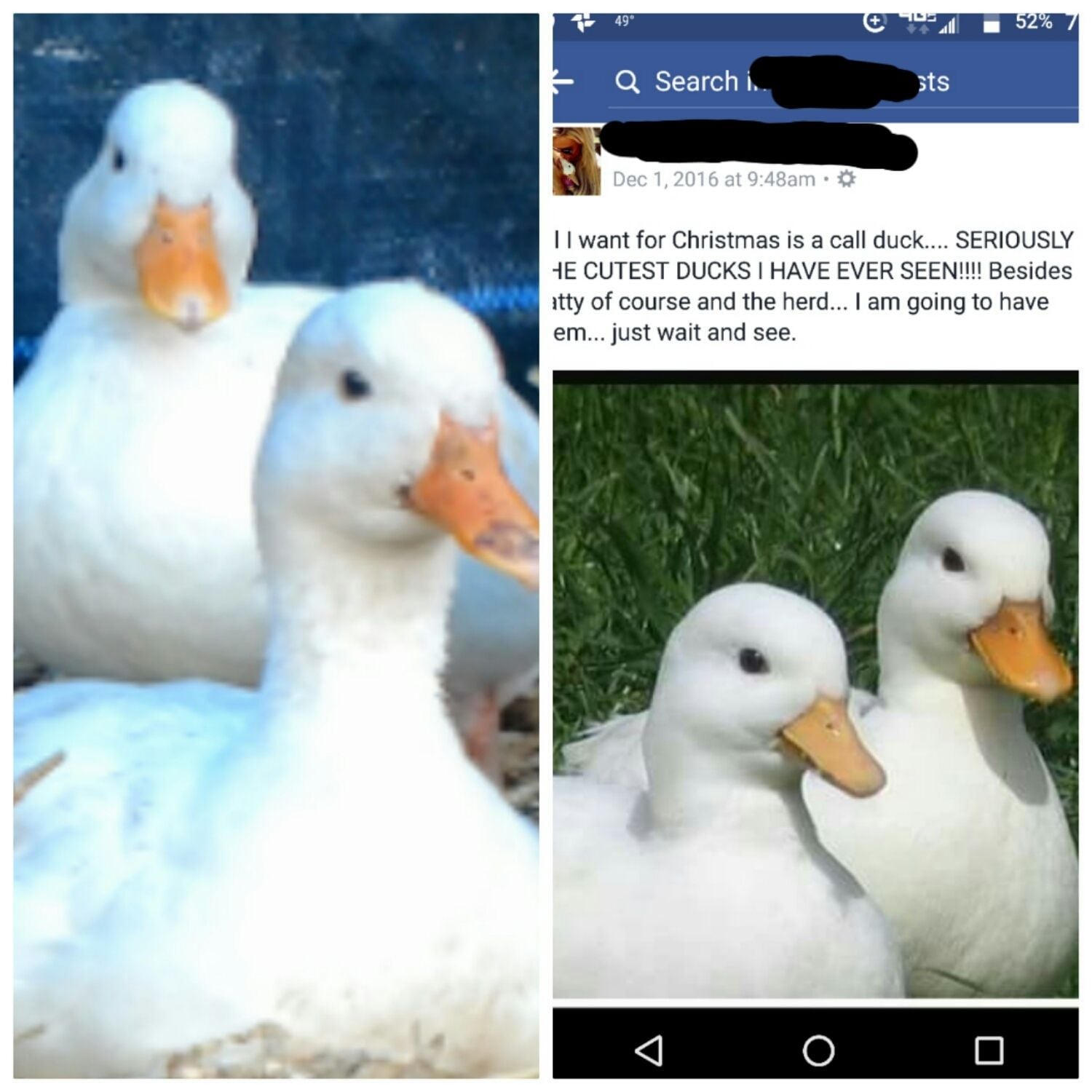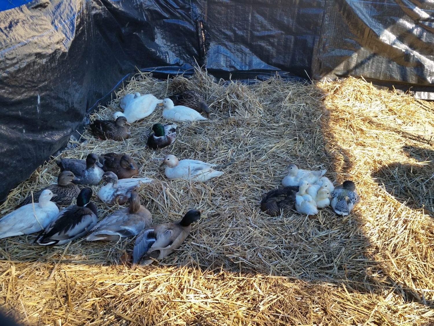 So yesterday we had a lot of rain come in and after I drove for 3 hours (yes I said that, I spend 6 hours a day in my car driving my kid to and from school) I noticed the tarp over the pin that had the calls in it was sinking, so I tried to remove the water and the tarp caved in on me causing havoc amongst the ducks. In turn causing them to panic, and then causing them to FLY AND RUN in a directions. After spending 4 hours searching in the rain, scaring my husband and friend Ravynfallon, and staying in the emergency room on an insulin drip, I am sad to report that as of today only 6 of the 15 calls are still here. And that's because I was able to catch them. Don't know how I was able to catch them but I was.. I was found holding 4 in my arms and don't remember much after that. My sugar dropped and so did I.
