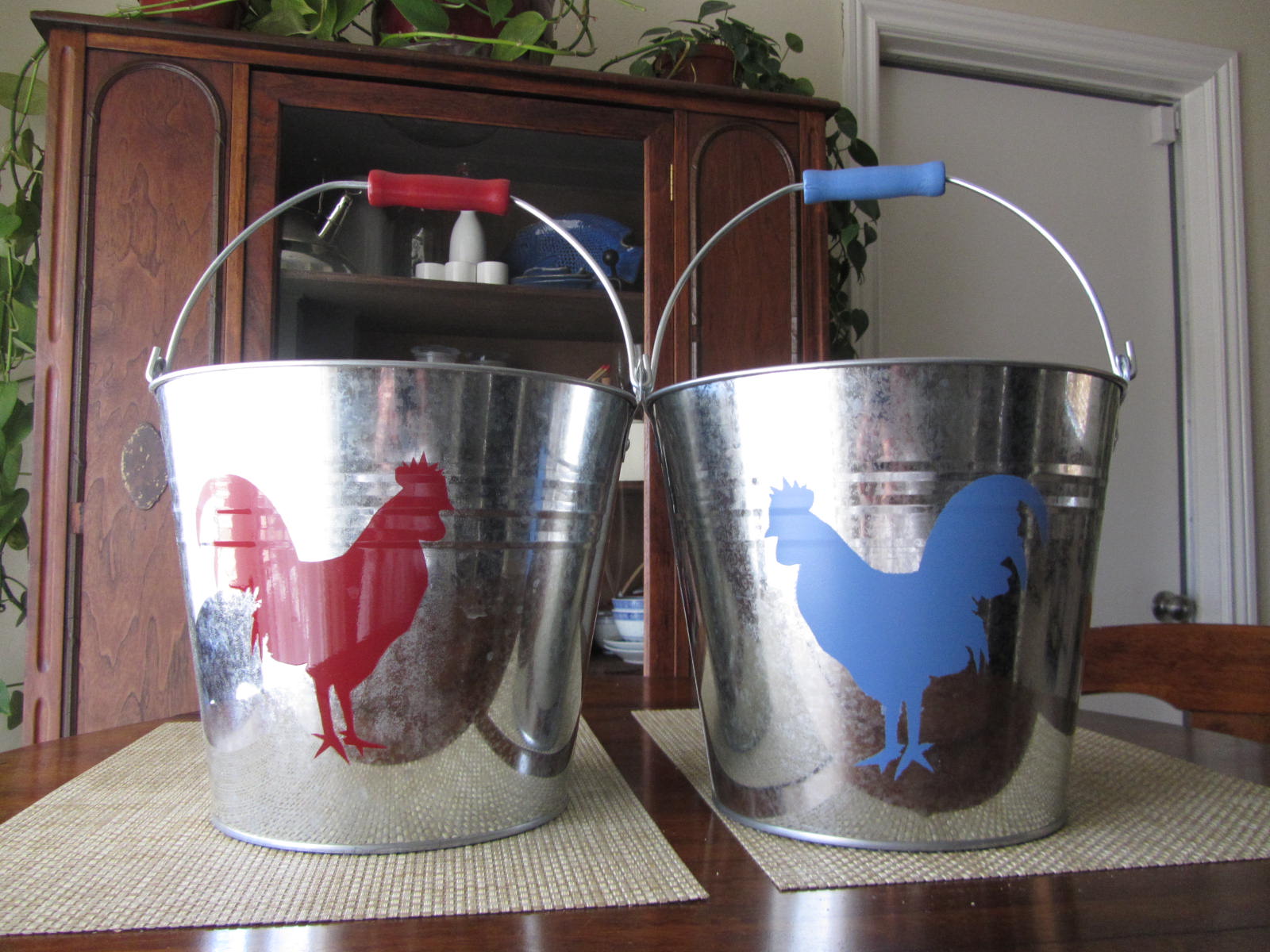I was at the .99 cent store and found 2 gallon galvanized metal buckets. I am always looking for useful items for my chickens and found these for 1.99. I bought a bunch of them and painted the wooden handles and a rooster on each of them. I painted blue for the water pail and red for the grain. I will be painting green for vegetable scraps.