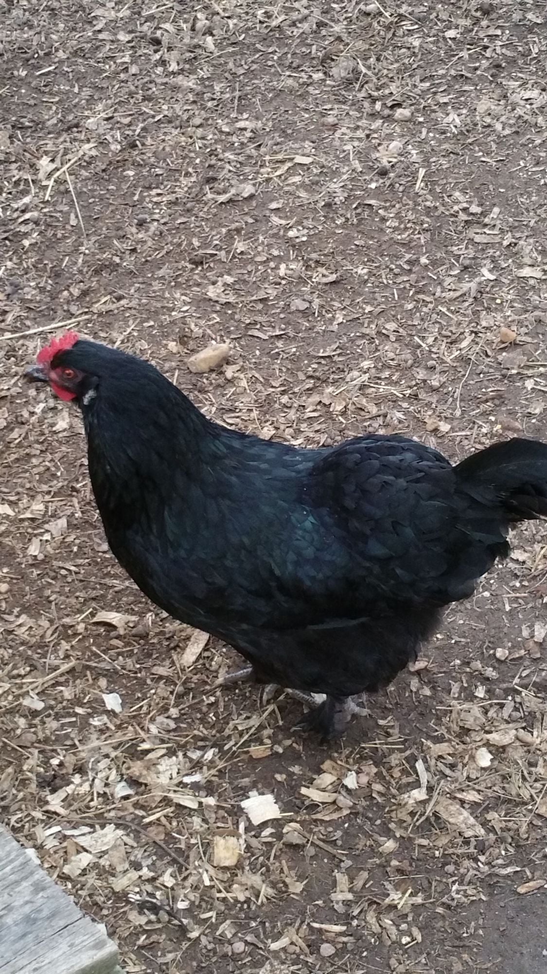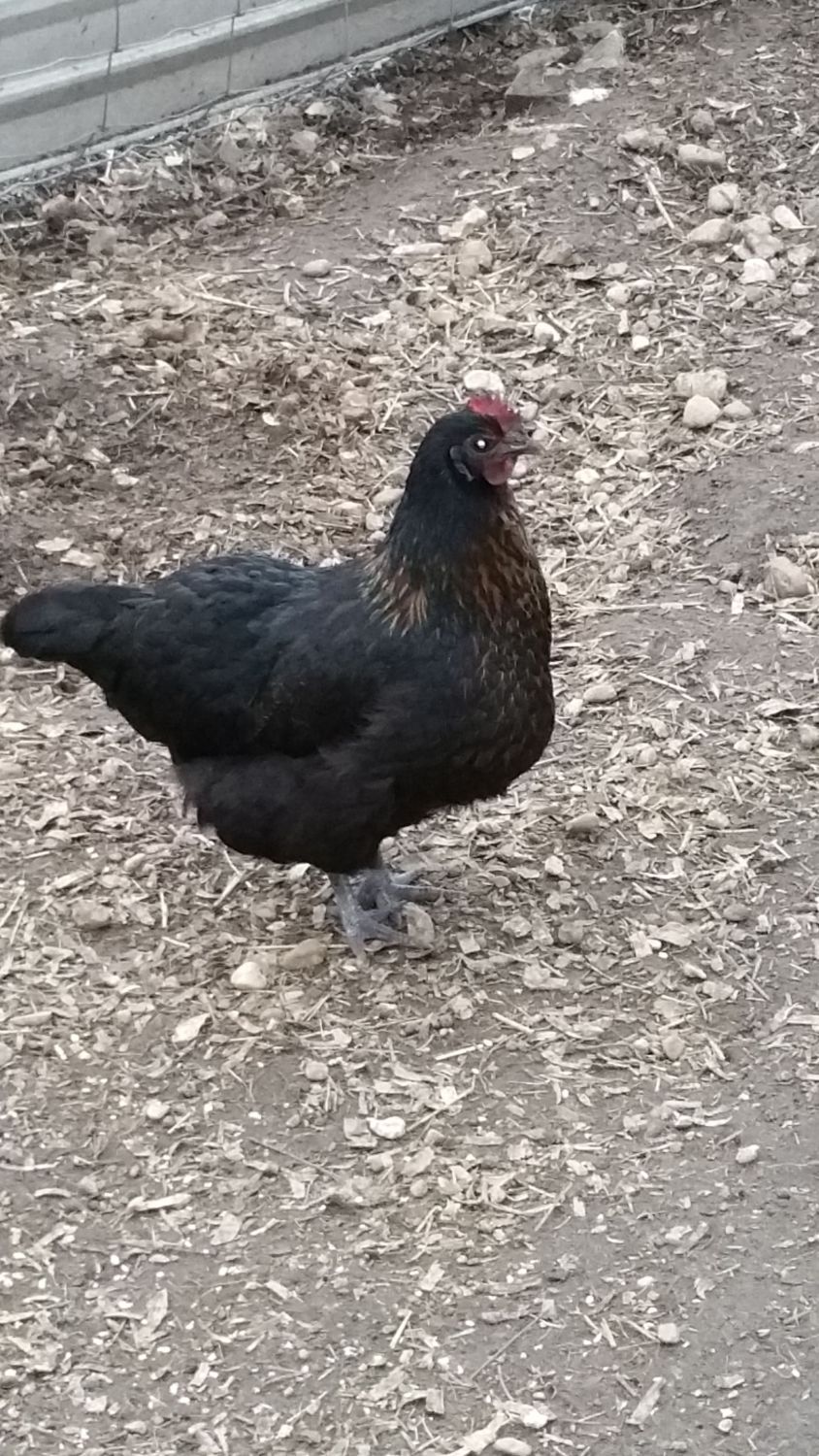 Hen 2: All black with gold on her neck. Feathers on legs. She has odd eyes. They are solid black.