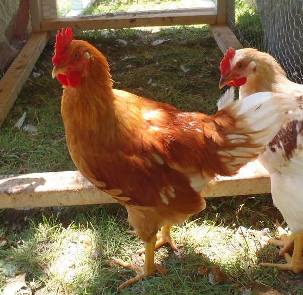 2 roos one old english game cock and one don't know but likes to crow. Both 9 weeks old