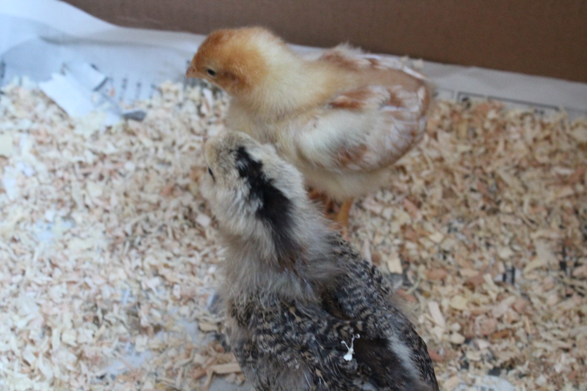 So I recently got 2 chicks from a feed store, hoping for some eggs in a couple months. I think the darker one was supposed to be an Ameraucana, though I doubt it from seeing other pictures. The yellow one is a sex link, at least that's what the lady told me.