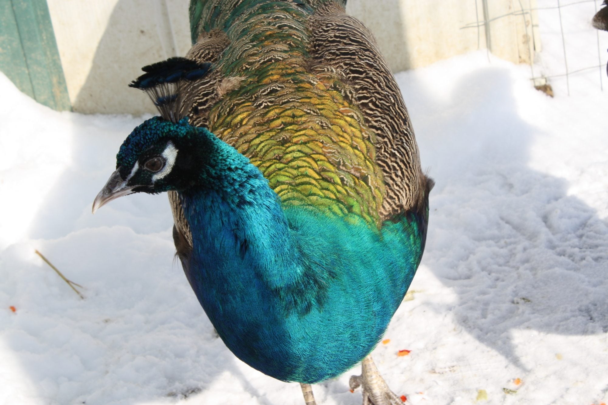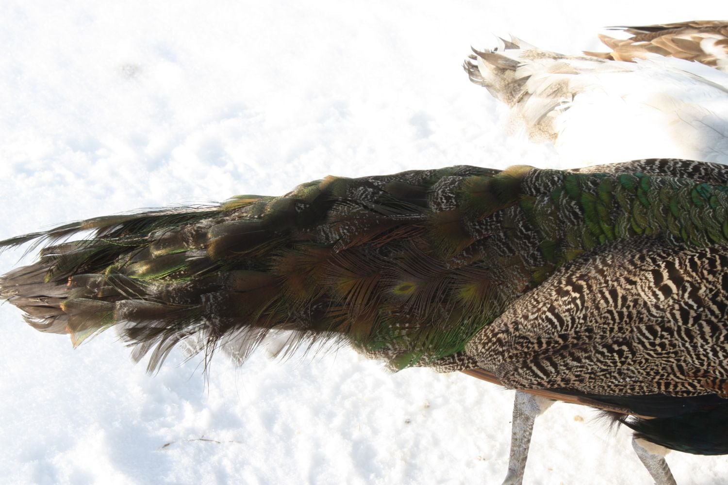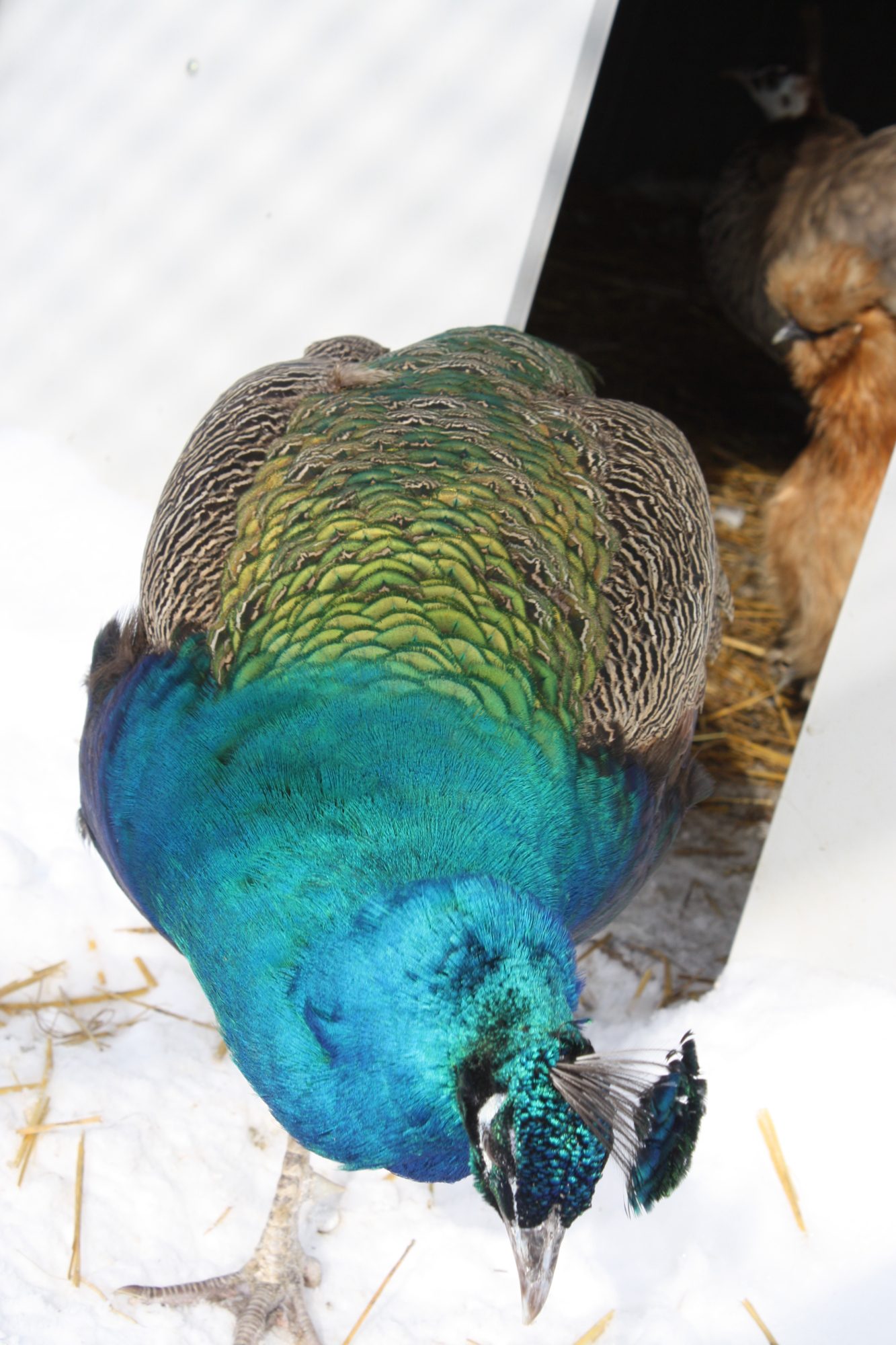 poppy had a couple small eye feathers last year (as a 1 year old)Mine get small trains but not one bird has eyes on a train until they are growing the 3 year trains. I do not know why some people's peas get eyes at 1-2 years and mine in CT don't LOL