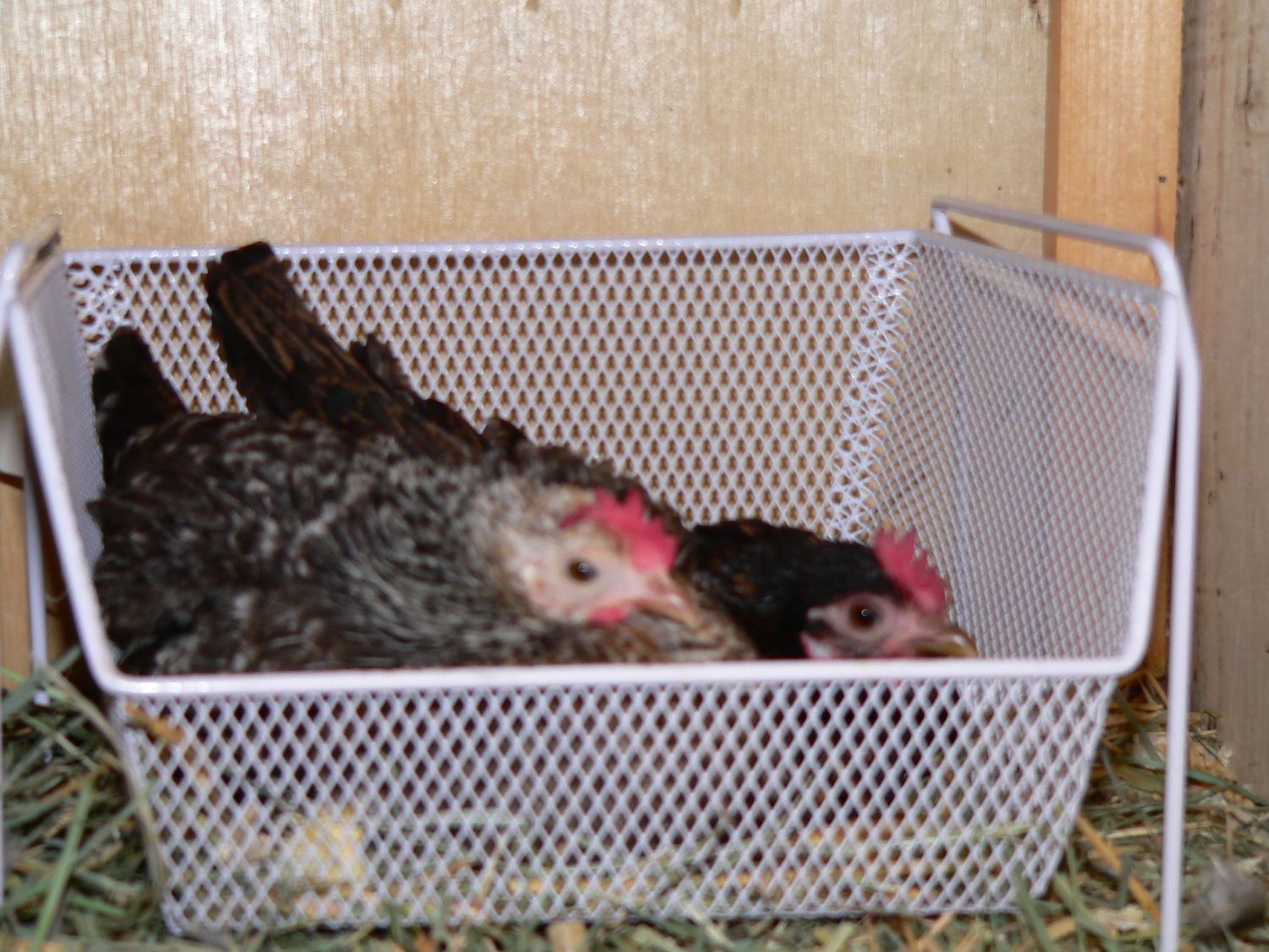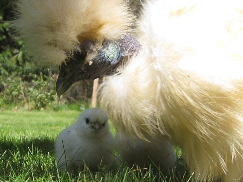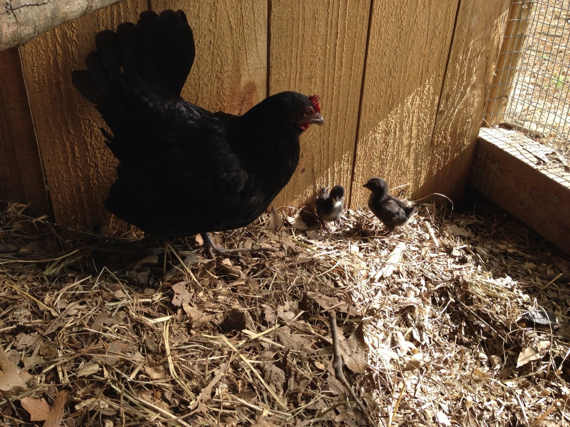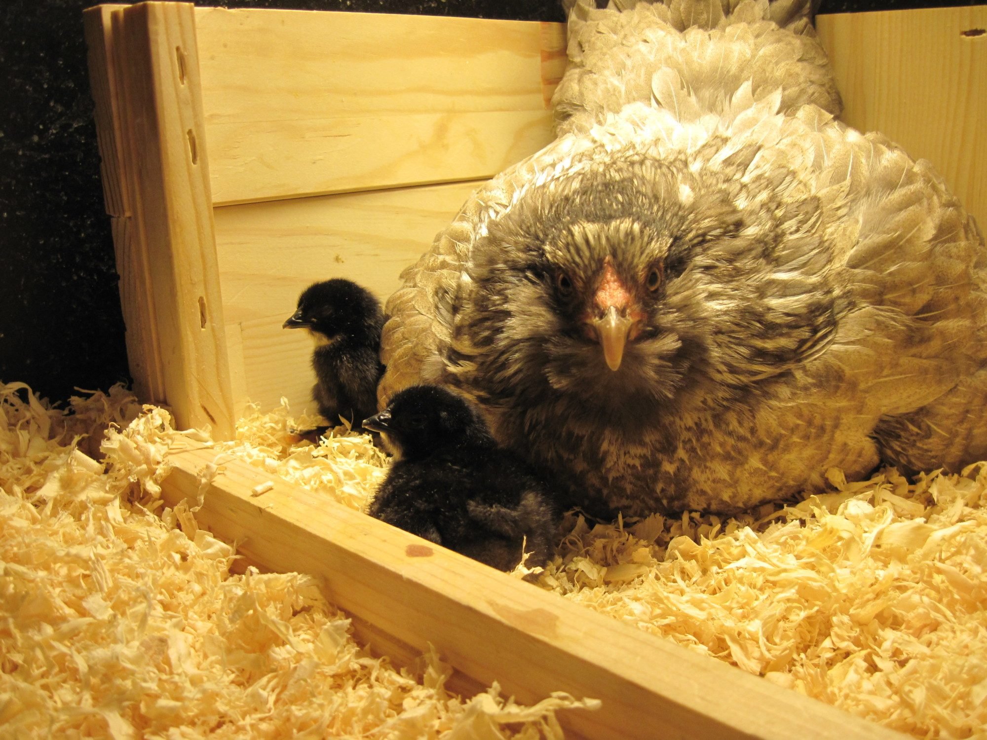 Lydia the Patridge Chantecler (1 yr old) is a first-time mom, but has tried several times to go broody. When she went broody again right before the set date, I moved her into a dog crate & put 10 eggs under her. When the incubator chicks hatched and dried, I gave her a few chicks and took her eggs and put them in the incubator to finish. She didn't like that, so I gave her 5 eggs that had already pipped. Once they hatched, she entered the "mothering" stage and has been in her glory ever since!