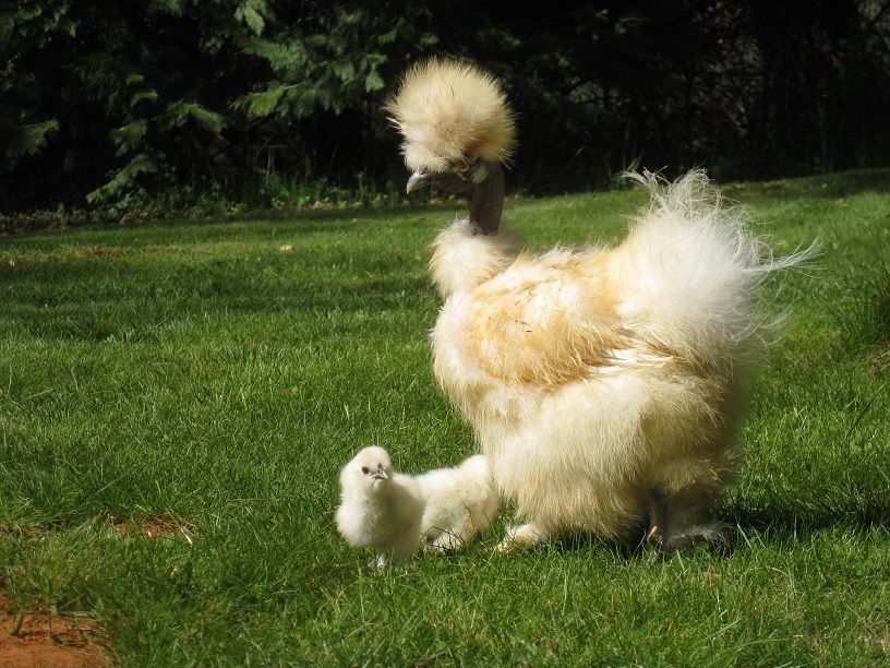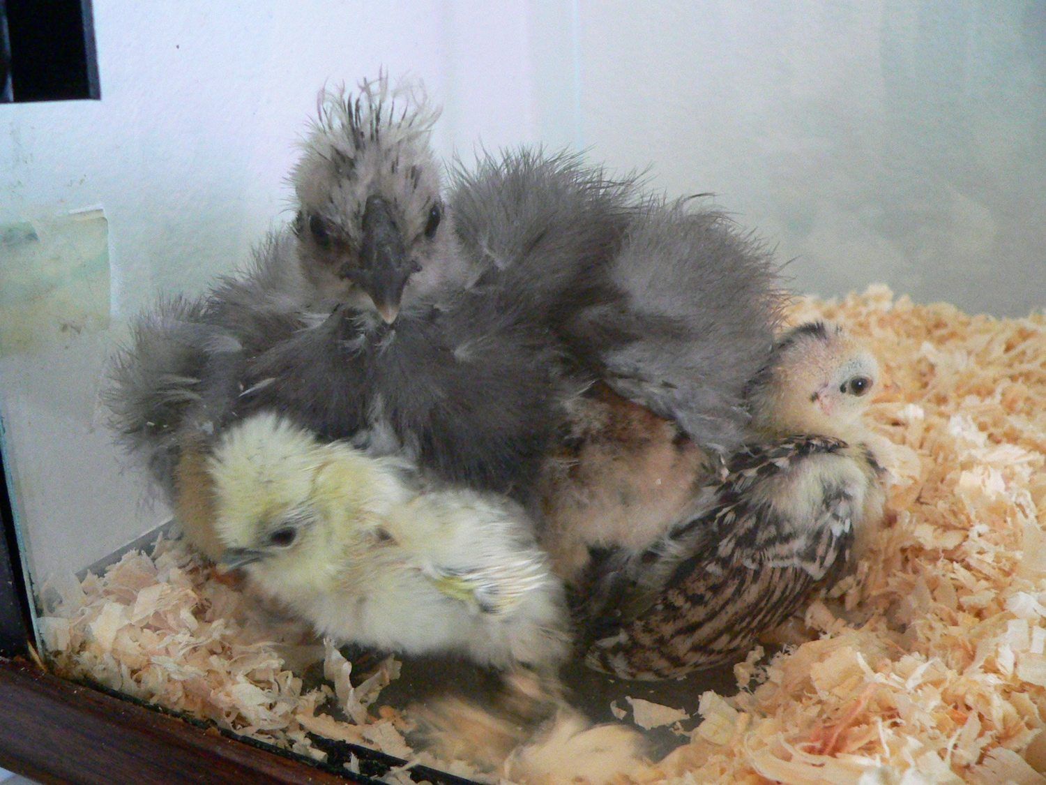 Not the best quality pics.... These are of black silchin "Bumblebee" with her chicks and fellow broodies. The 5 chicks were hatched by all three broodies: Bumblebee, Buff Silchin "stinky" and Cochin "Penguino"...