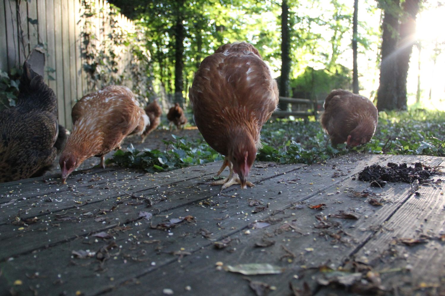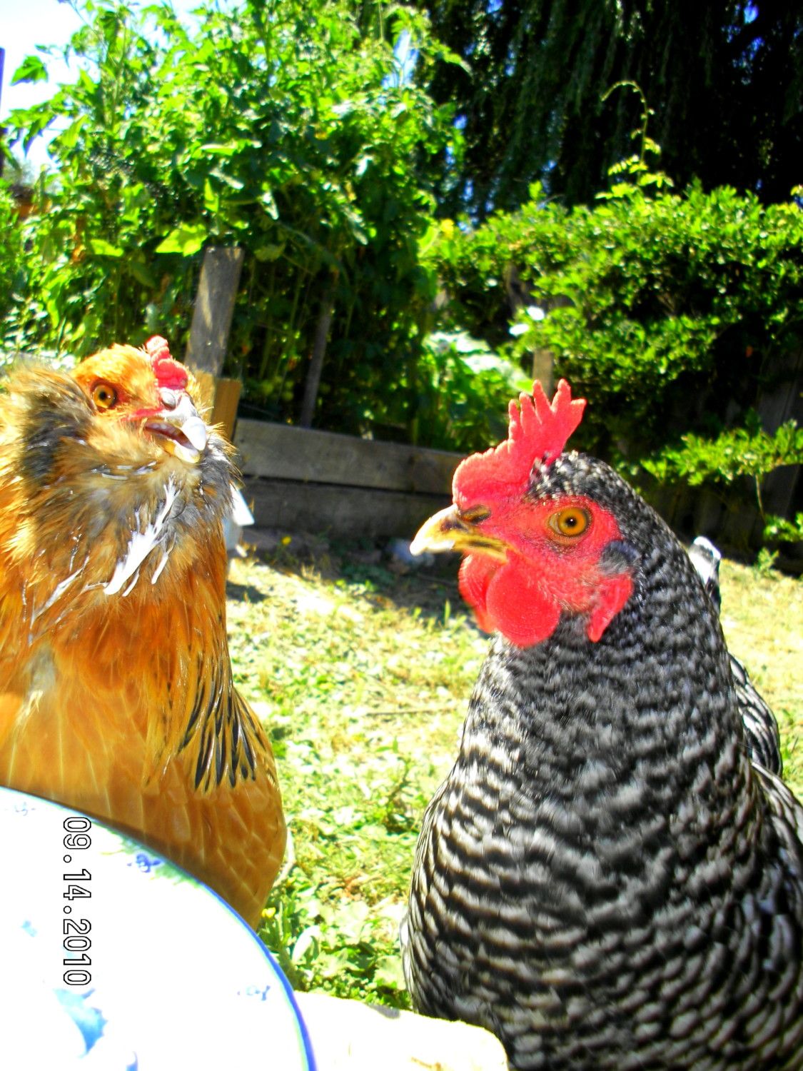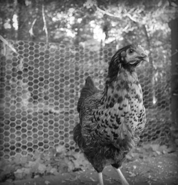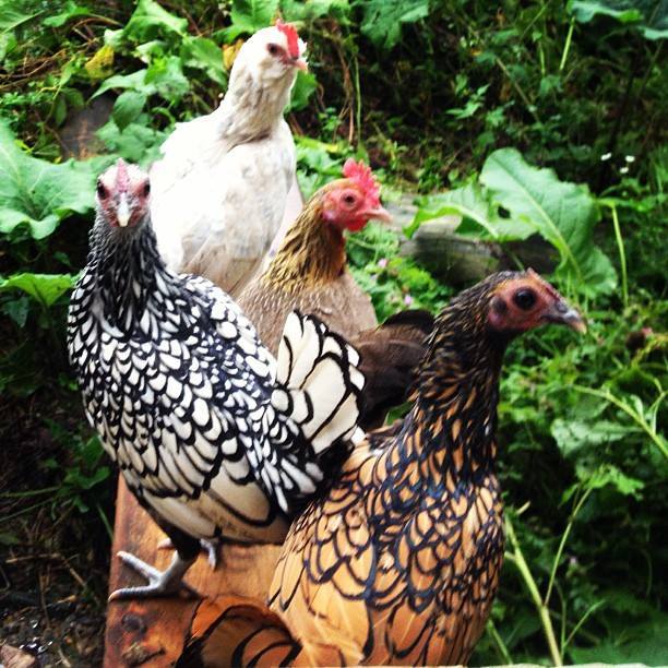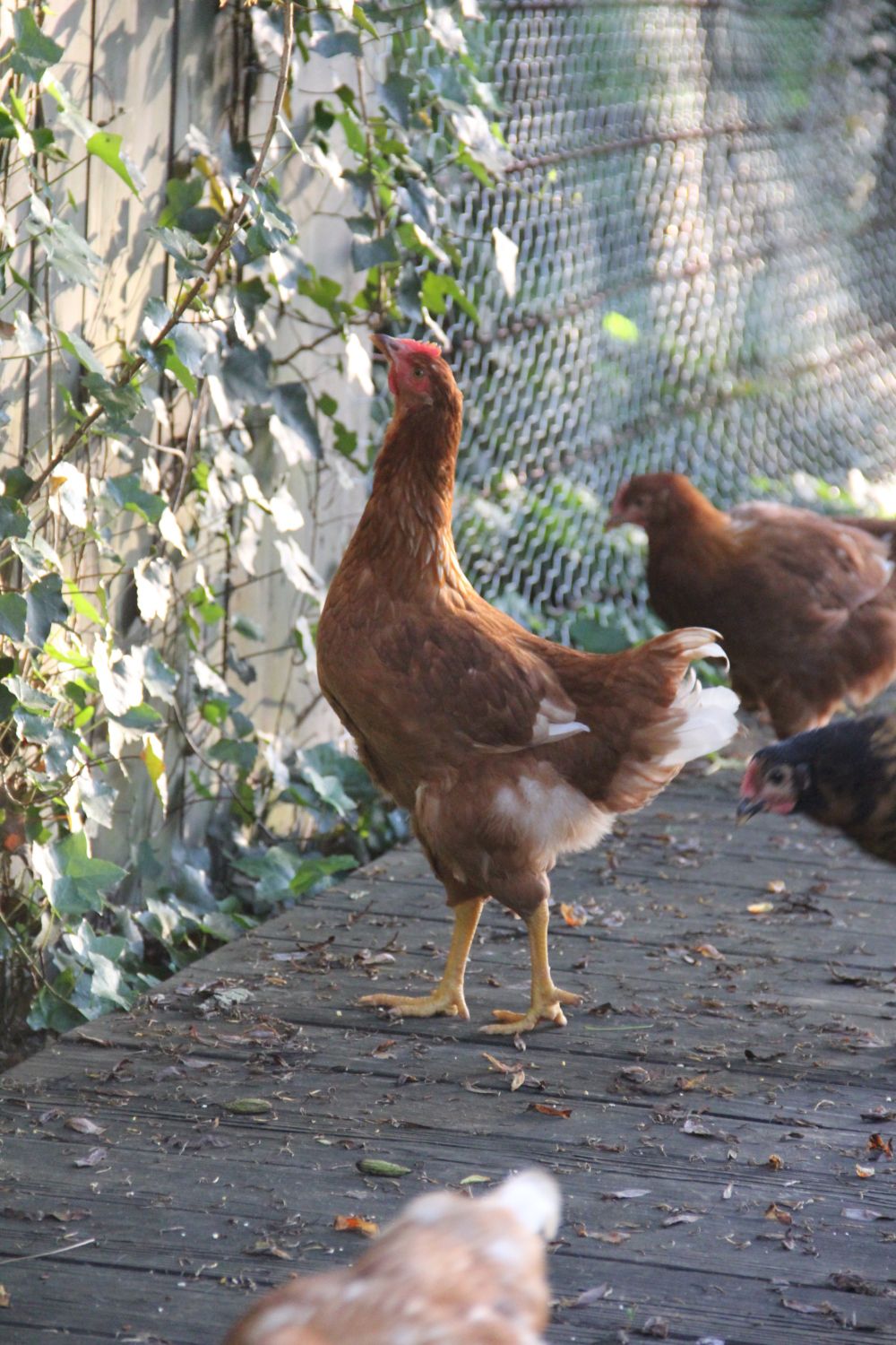 Emma, Holly (she roosts in the holly tree very night), Pup (she LOVE to follow around our dogs and even perches on them if she gets the chance!) and Mama (Black sexlink on left, she was our first broody hen!)