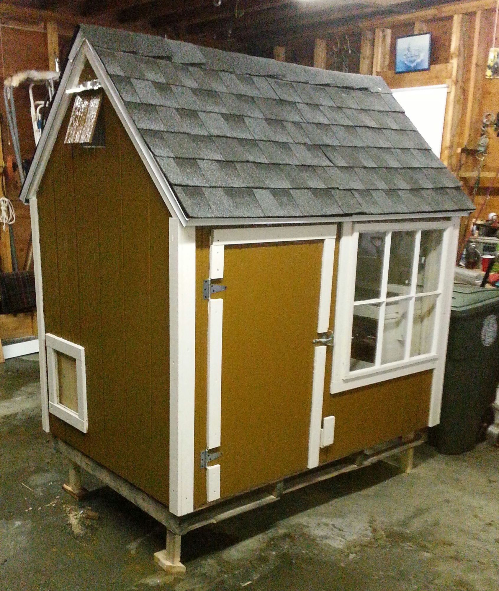 I started building in February and finished last week, no plans just an idea of what I wanted 4X6X7ft tall, I wanted something i can stand up in, the window was reclaimed from a neighbor who is tearing down his barn, got a deal on a couple of bundles of damaged shingles $11, home depot has a 70 percent off rack with slightly damaged lumber so I raided that, painted the inside and all the paint came from habitat for humanity restore $18, I'm very pleased with the outcome just have to wait for the 3 feet of snow to go away and move it out back:-D