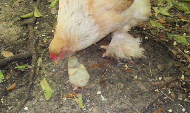 Name: No name yet Breed: Brahma Age: 2 days in first picture, 4 days in second First picture, you can see feet and little beak poking out of mama's side. First chick of the year!