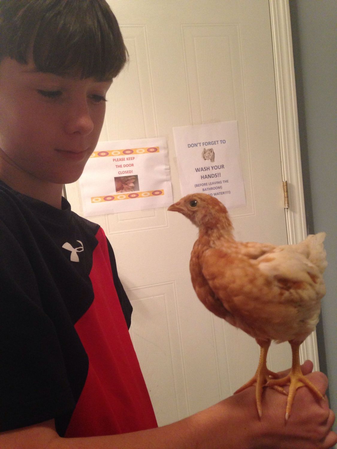 This is a 4 wk old red pullet (bought at TSC so we are unsure of breed) named Ugly. She loves to be held and talked too. My son, Charlie says she is the friendliest of our birds.